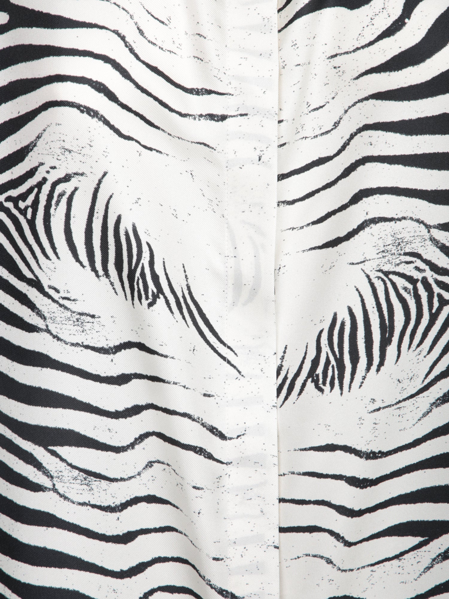 Long sleeve silk shirt. Black and white zebra print. Classic collar with chain detail.