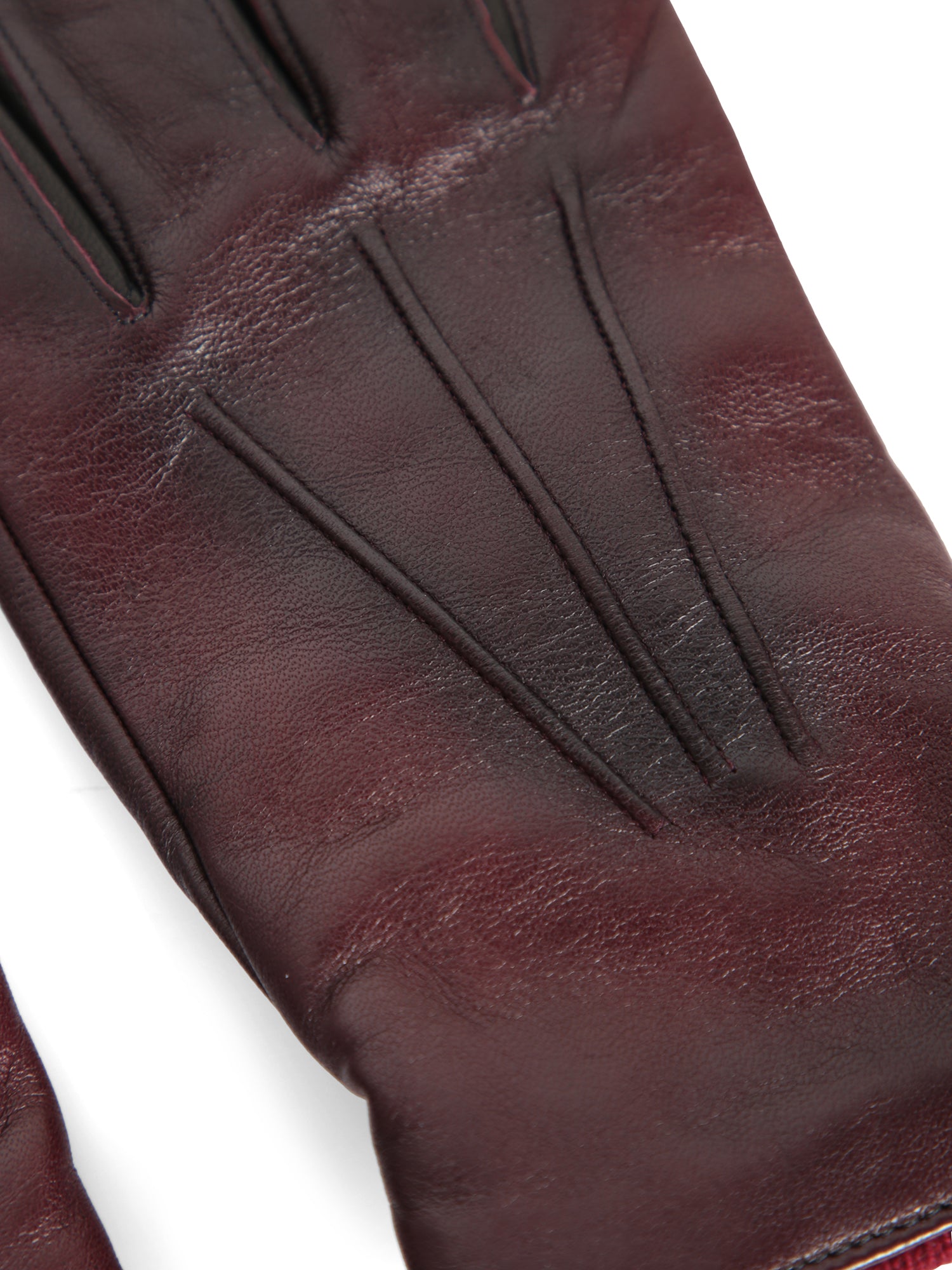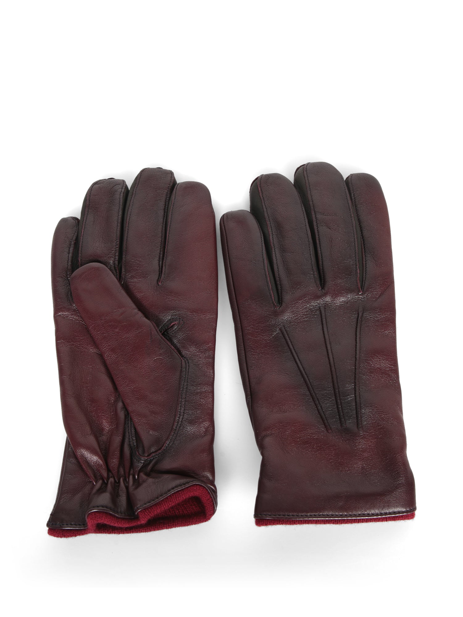 Smooth burgundy leather gloves. Lined with red merino wool knit. Elasticated cuff.