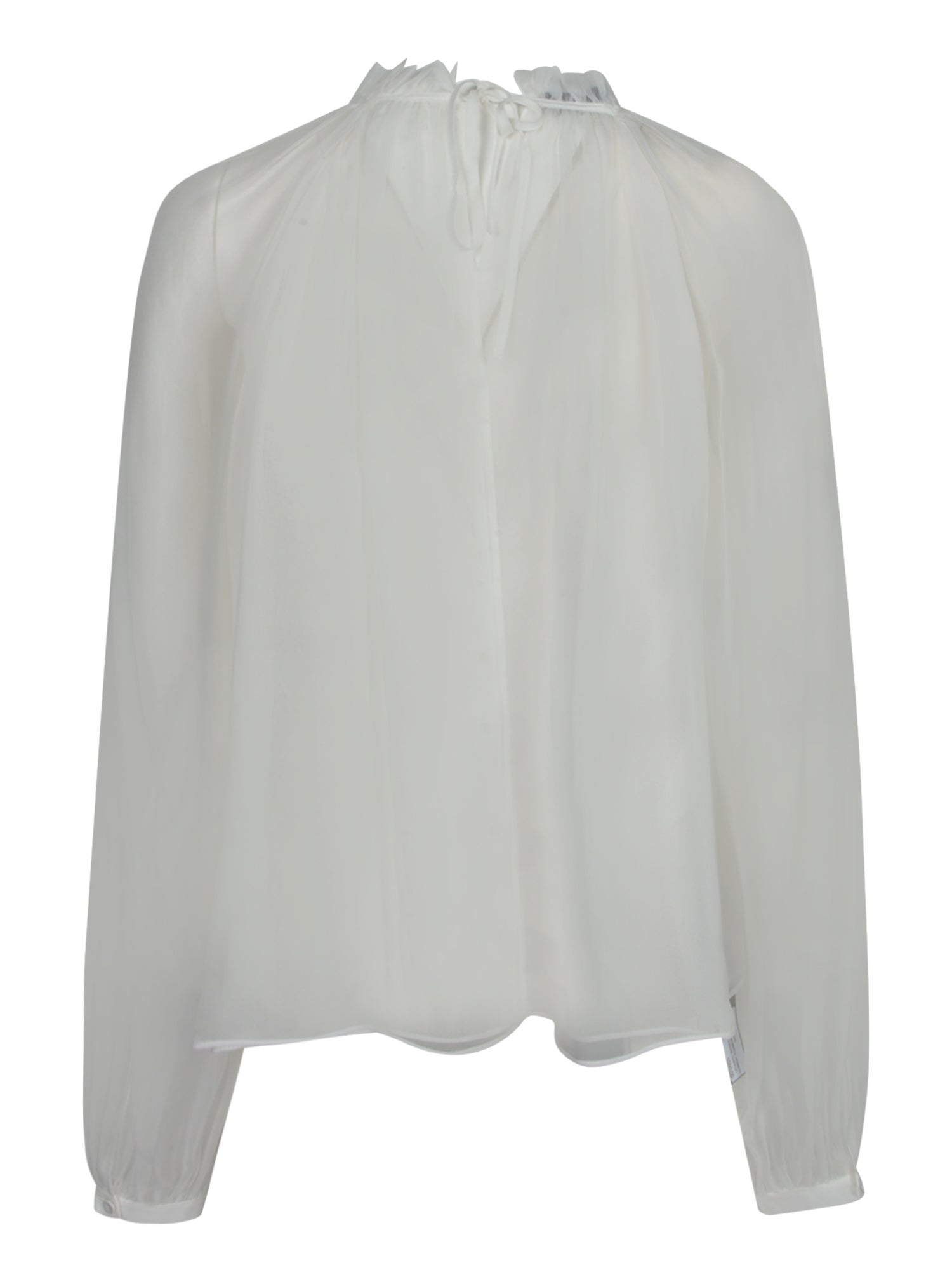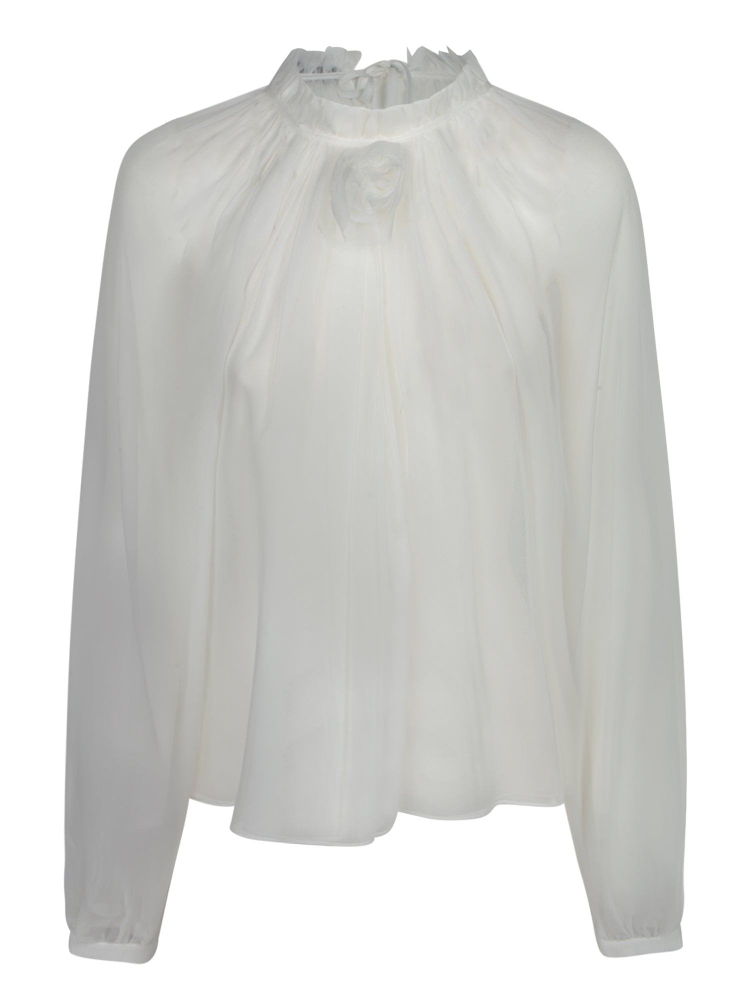 Long sleeves with elastic cuffs. Floral detail at high neck. Back button closure.