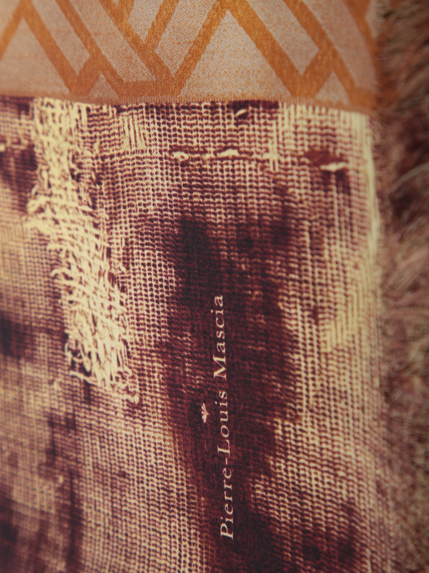 Multicolored scarf made from silk and modal fabric, featuring decorative fringes and mixed weave detailing.