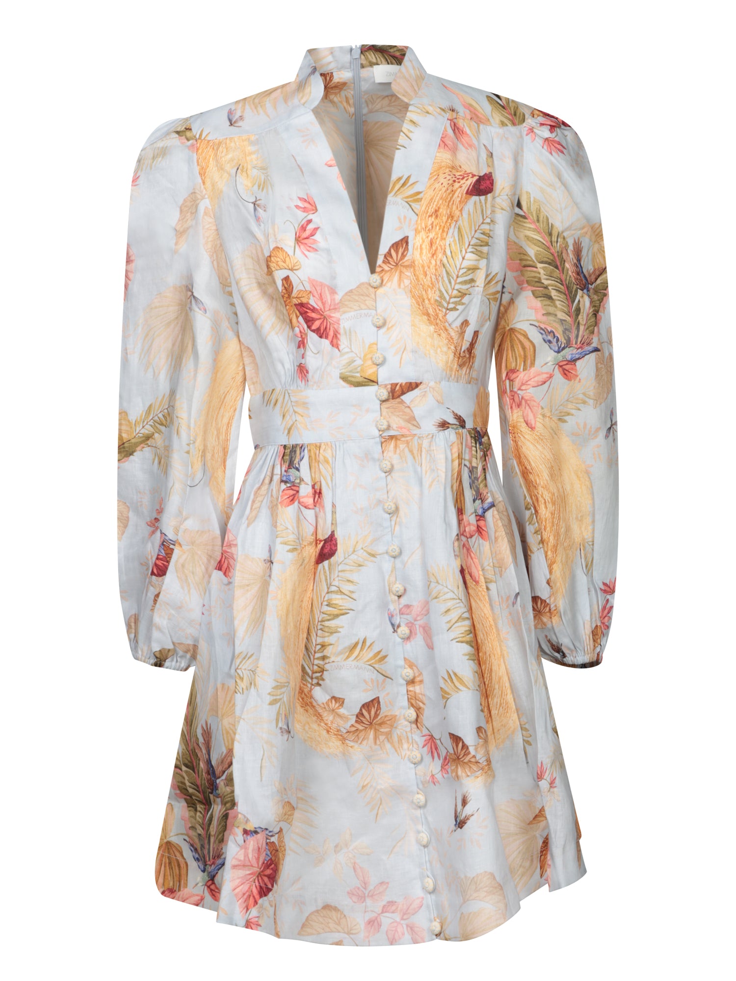 Long sleeves, V-neckline, front button closure, matching fabric belt.