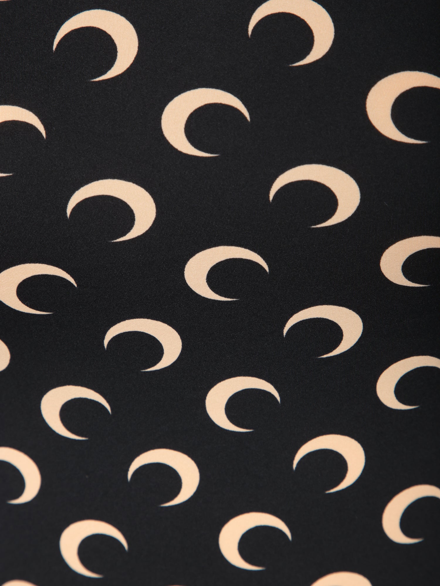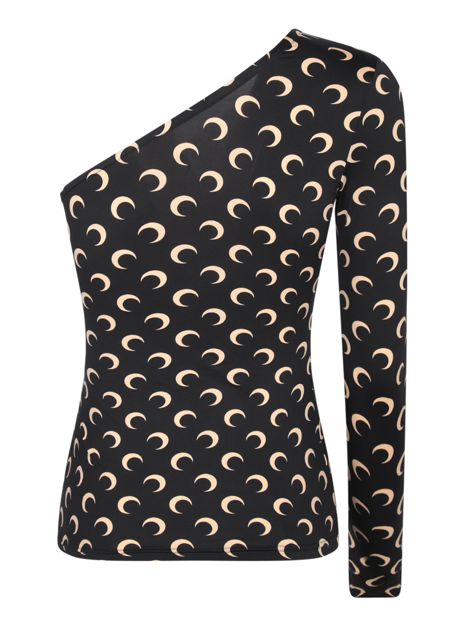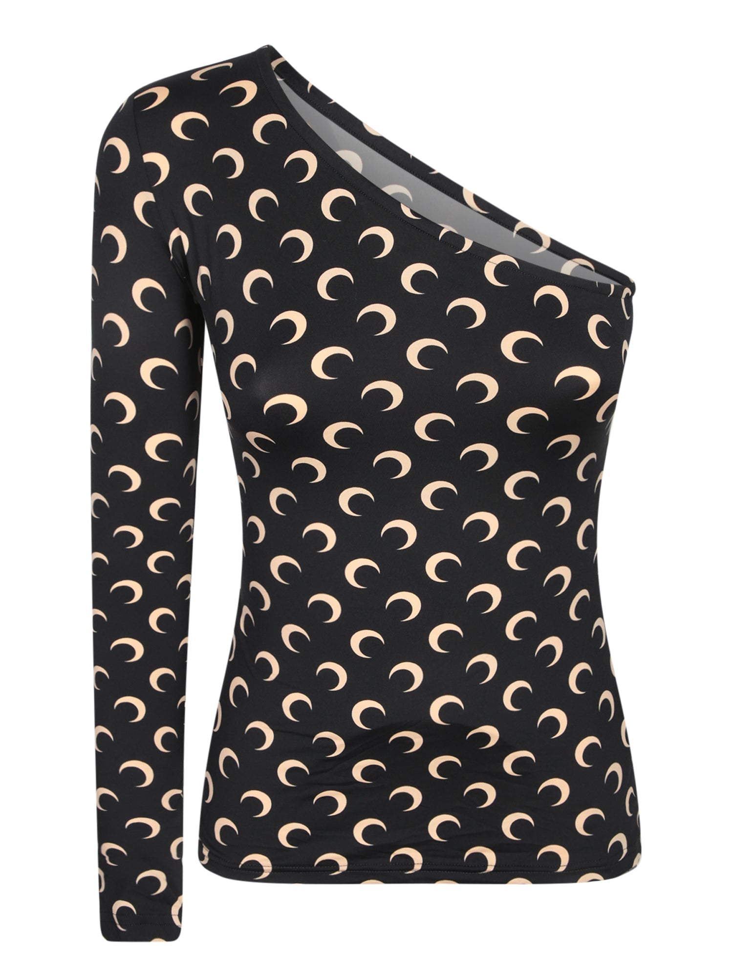 Asymmetric long sleeve top. Beige crescent moon print on a black background. Asymmetric neckline.