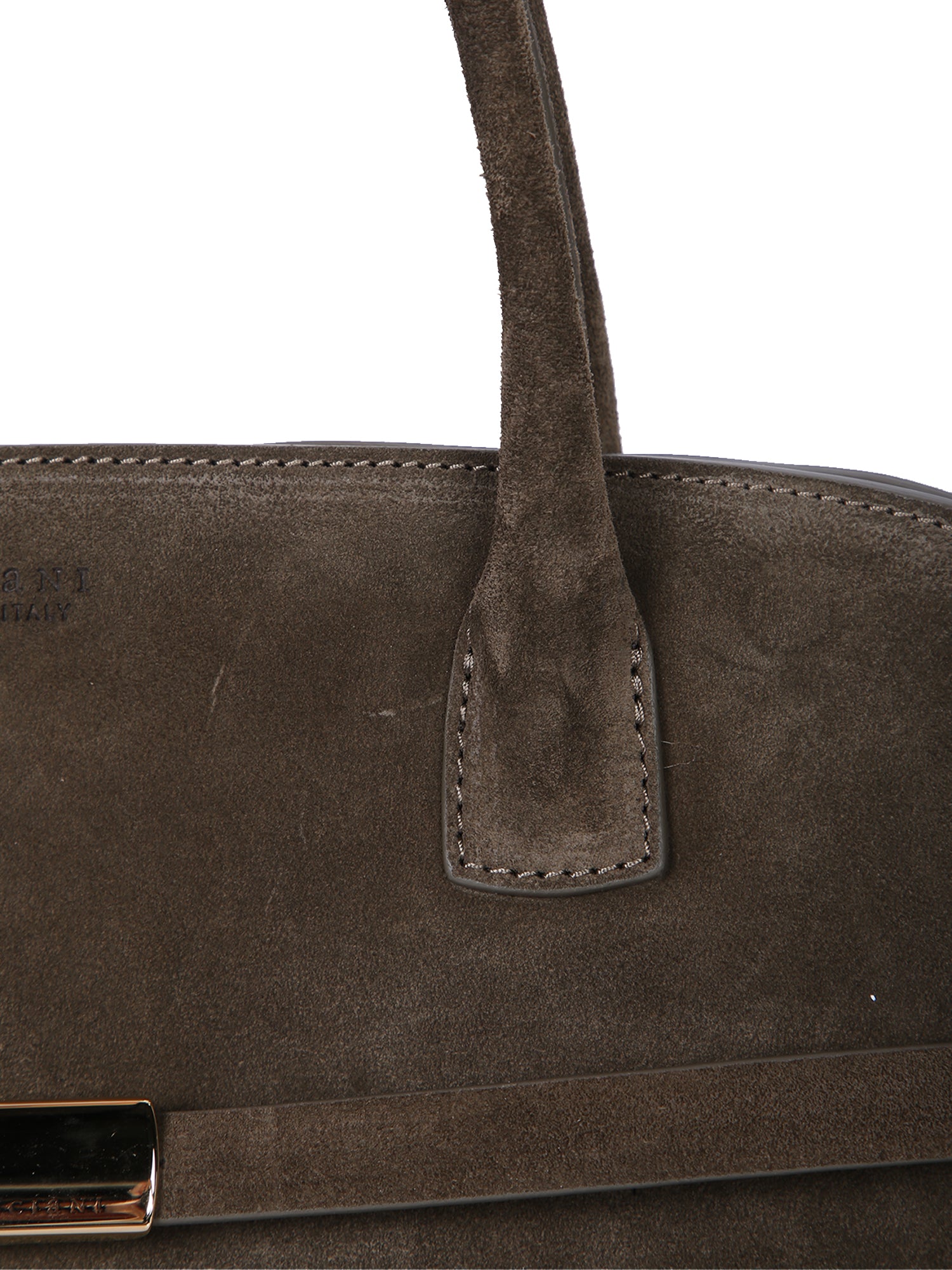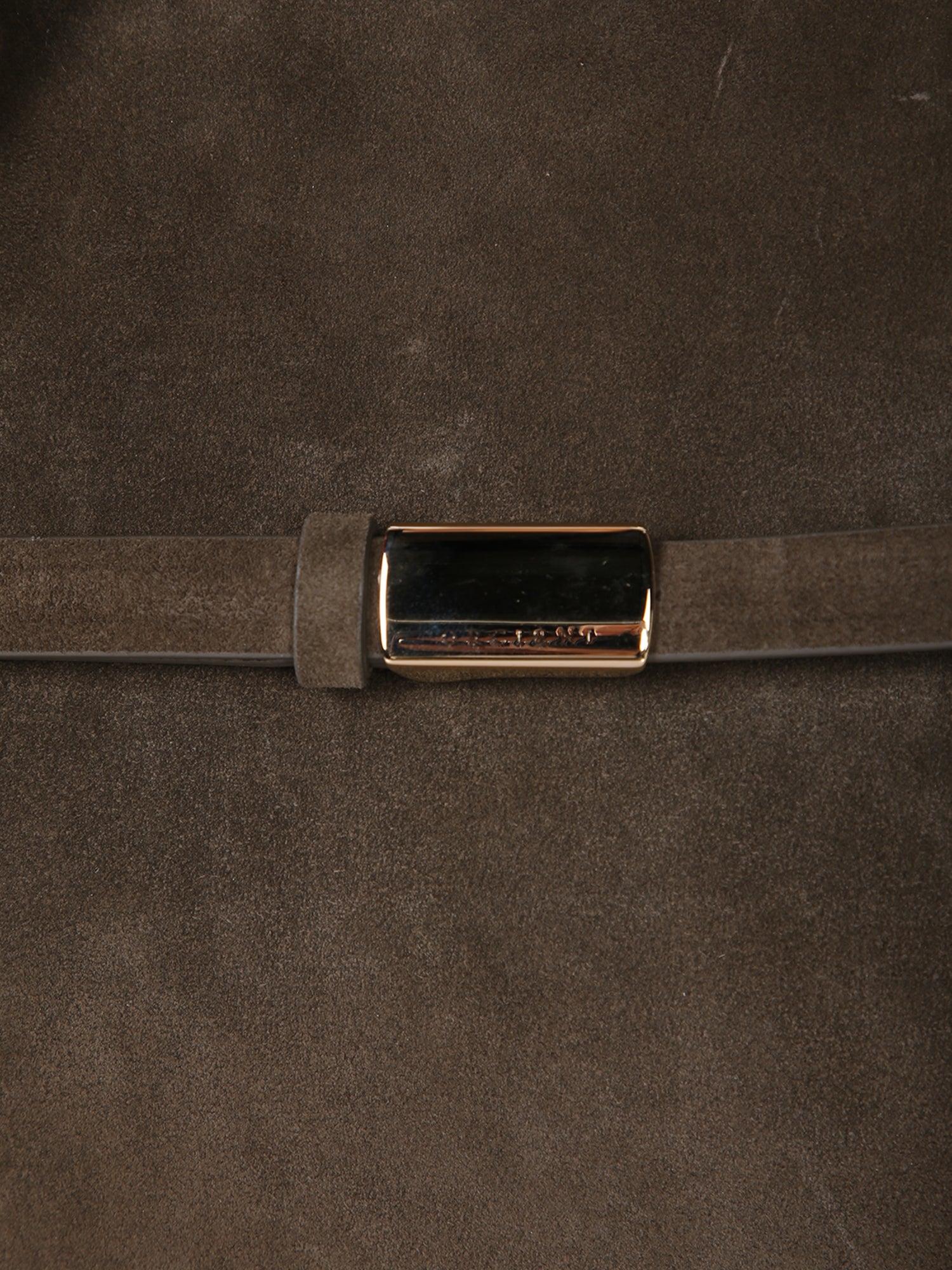 Suede bag with an adjustable and removable shoulder strap. Zip and front buckle closure.