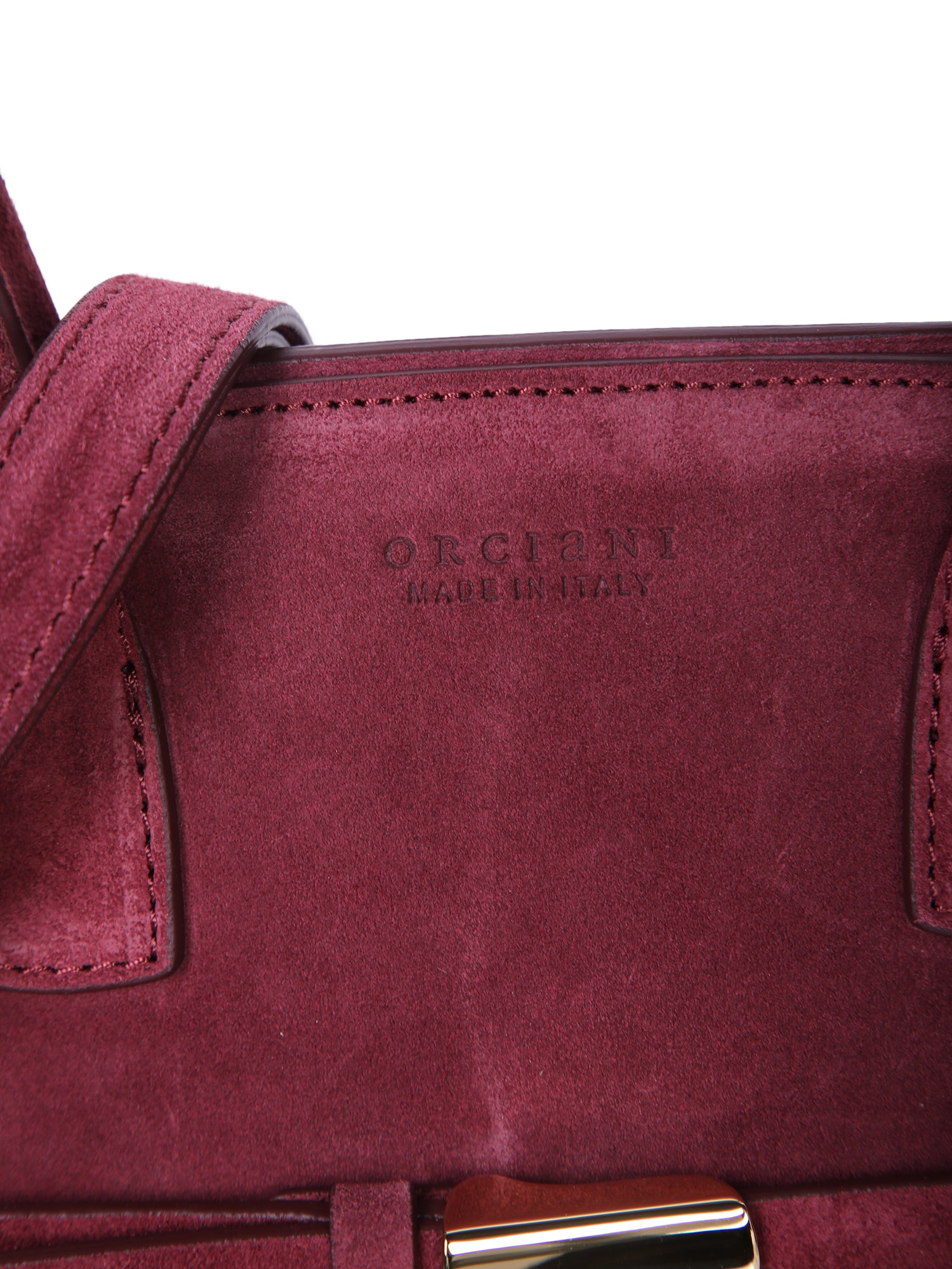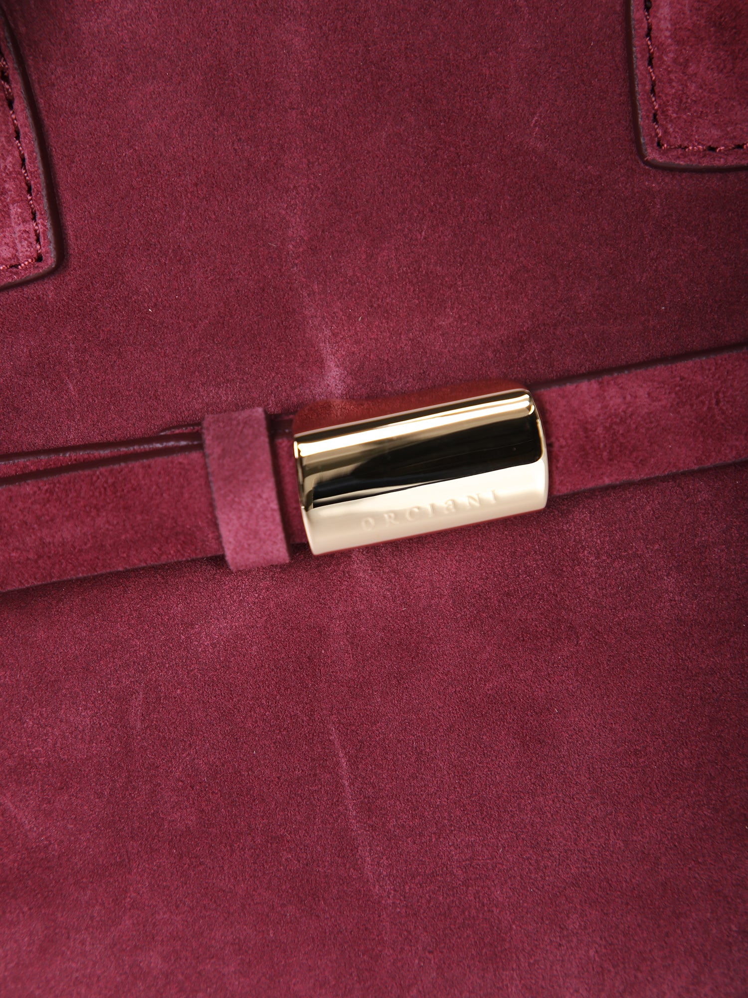 Suede leather bag. Top handle and adjustable shoulder strap. Metal buckle closure.