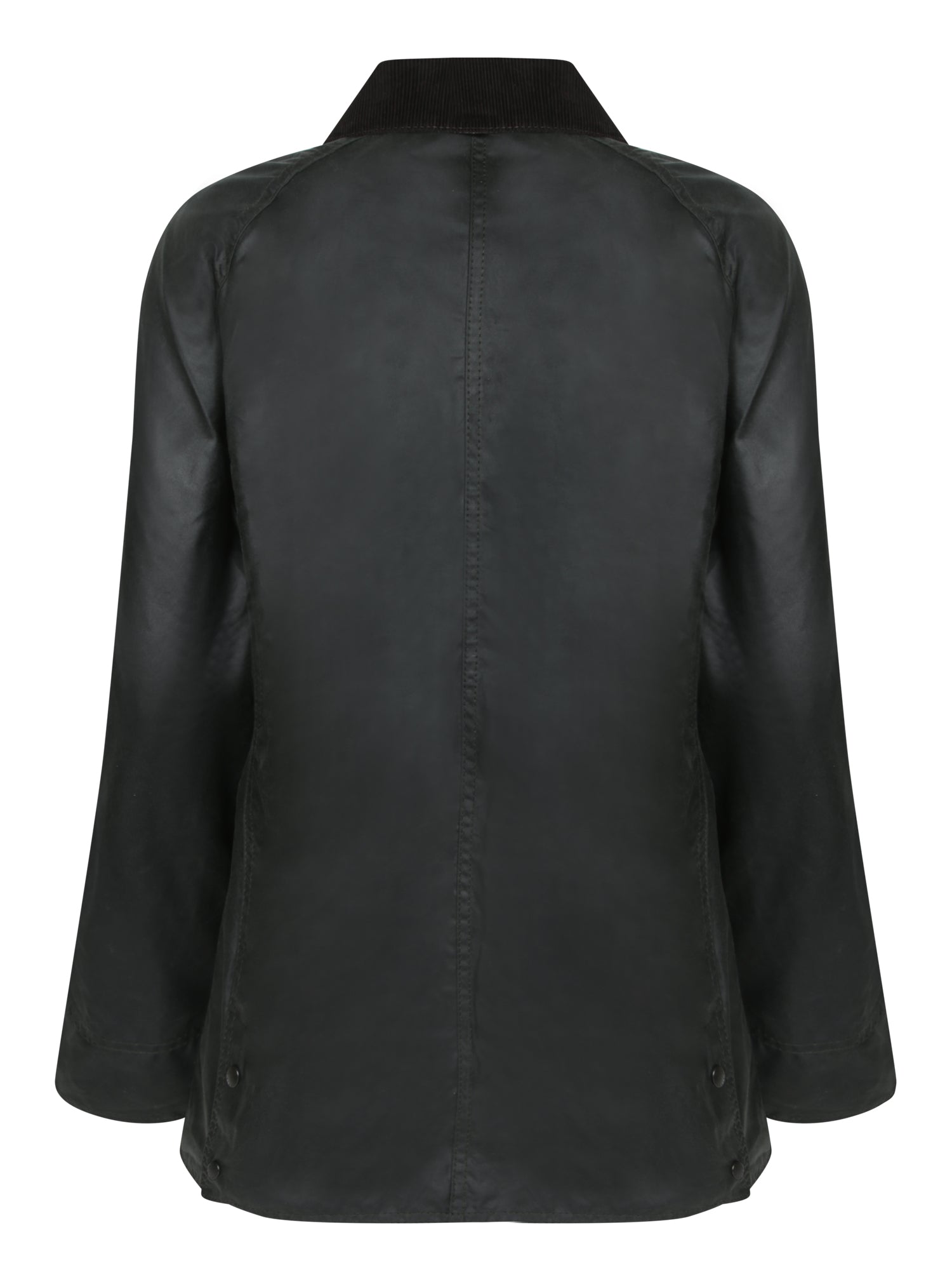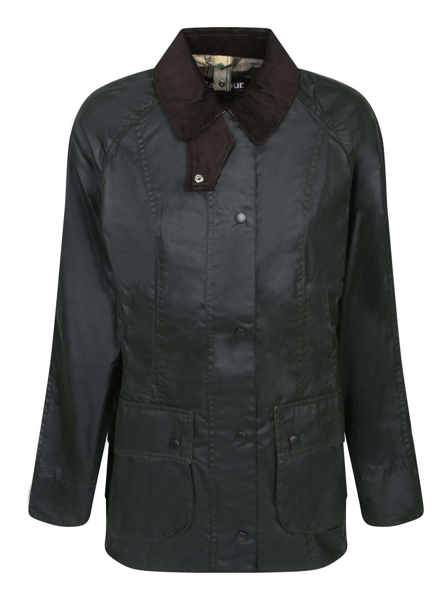 Waxed jacket with corduroy collar, button closure, patch pockets, and tartan lining.