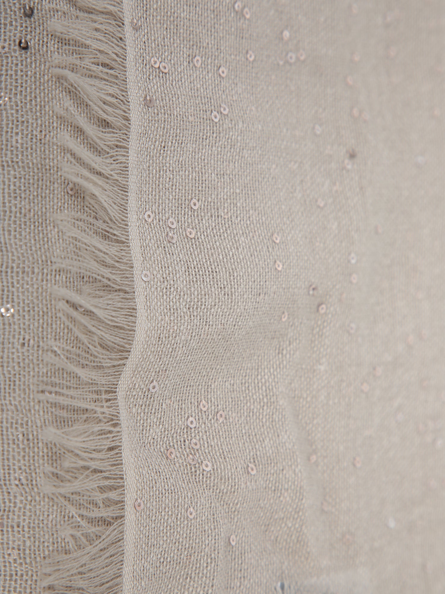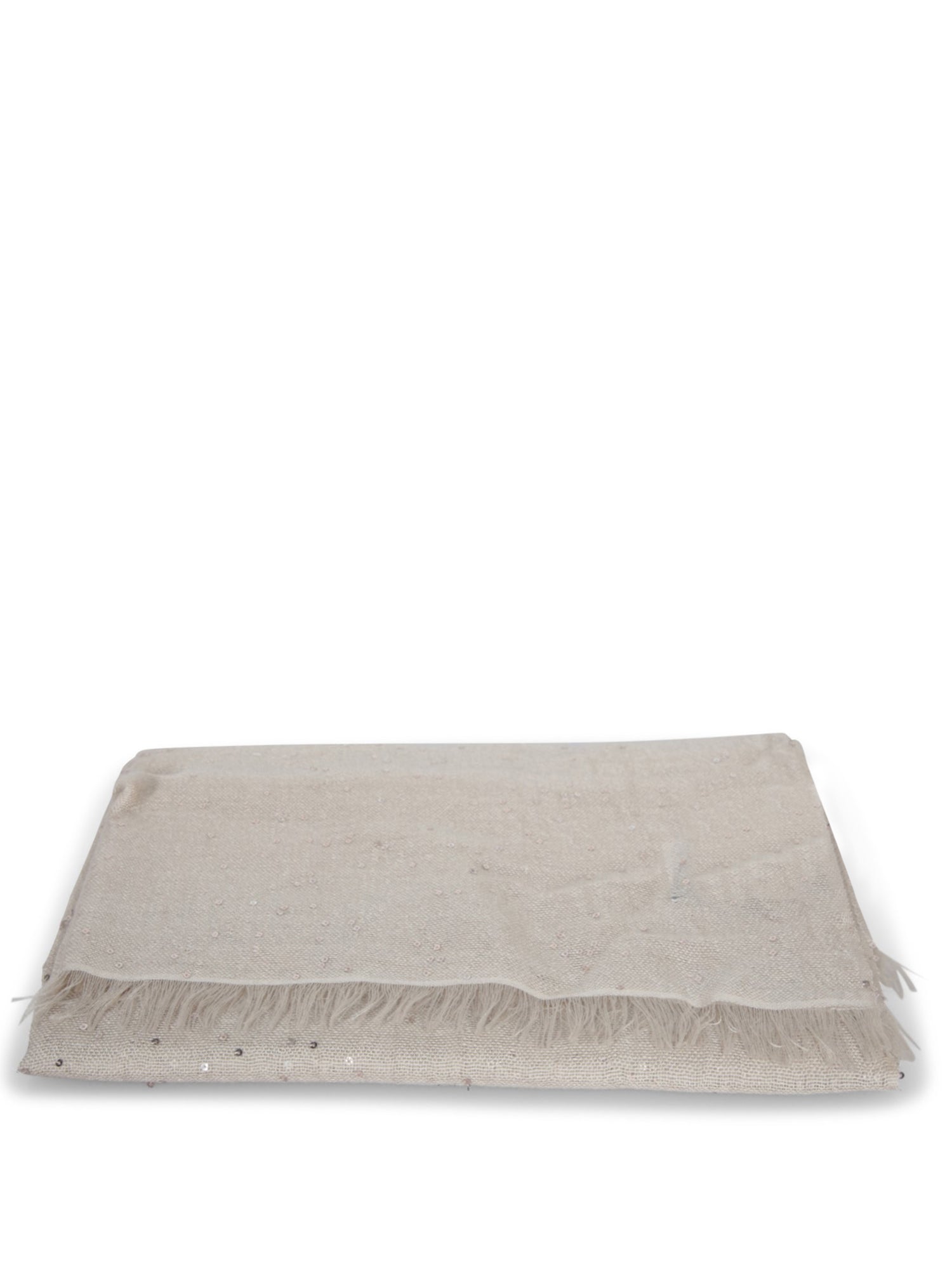 This Brunello Cucinelli scarf, elegant in its simplicity, is enhanced with delicate rhinestone details that add a touch of understated luxury. The slender fringes give it a classic and timeless look.