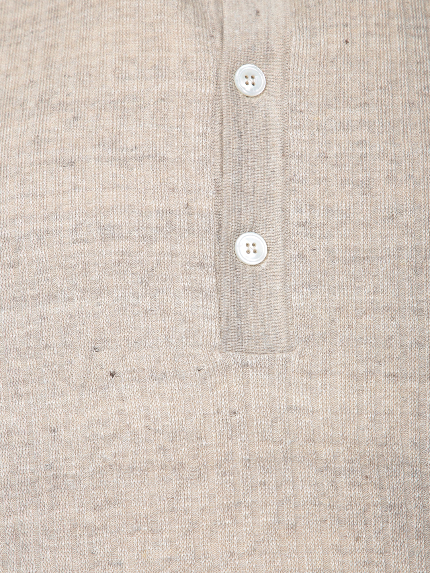 Short sleeve polo. Linen-cotton blend fabric. Classic collar with three-button placket.