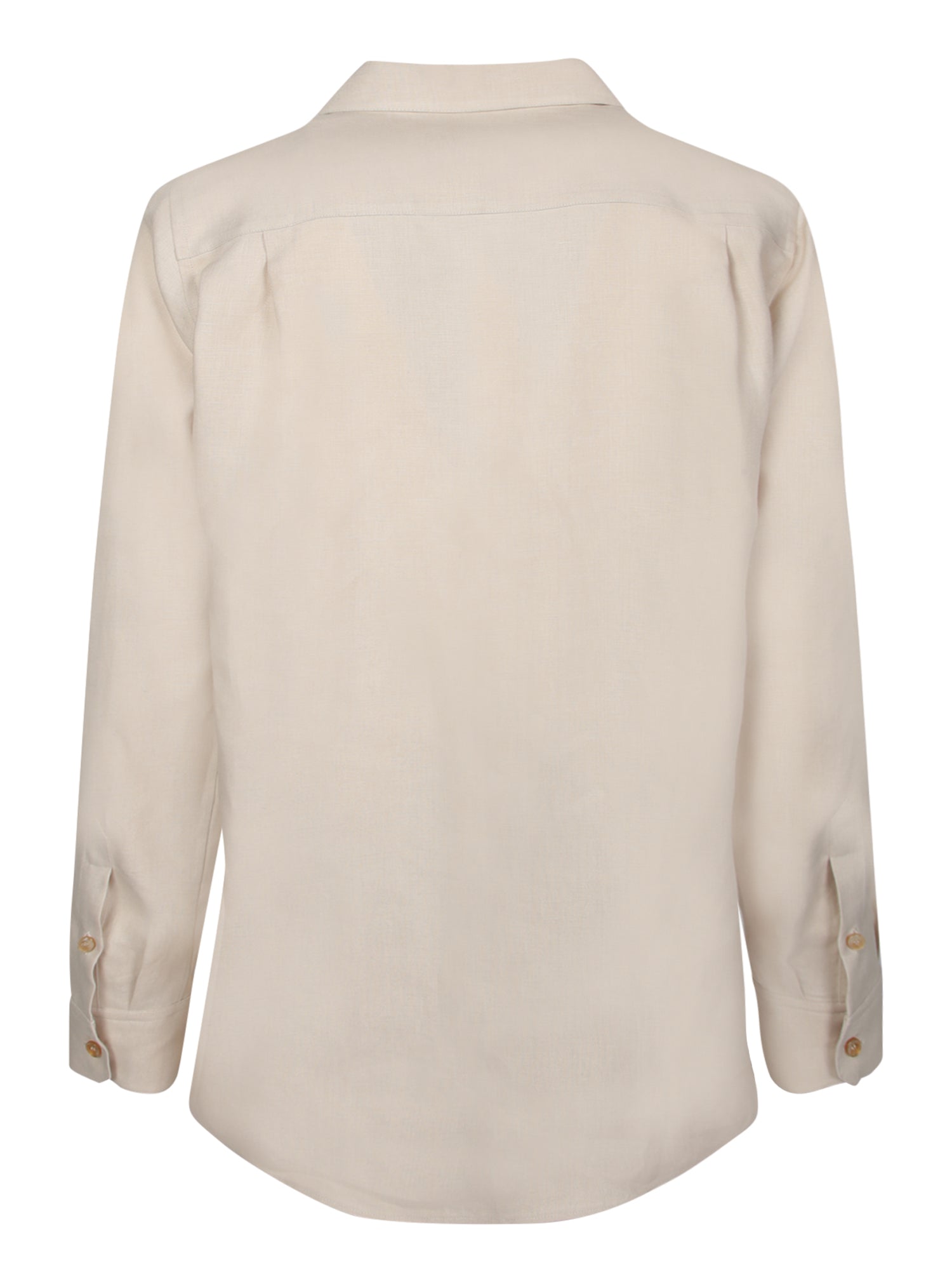Classic cut linen shirt featuring a pointed collar and front button closure.