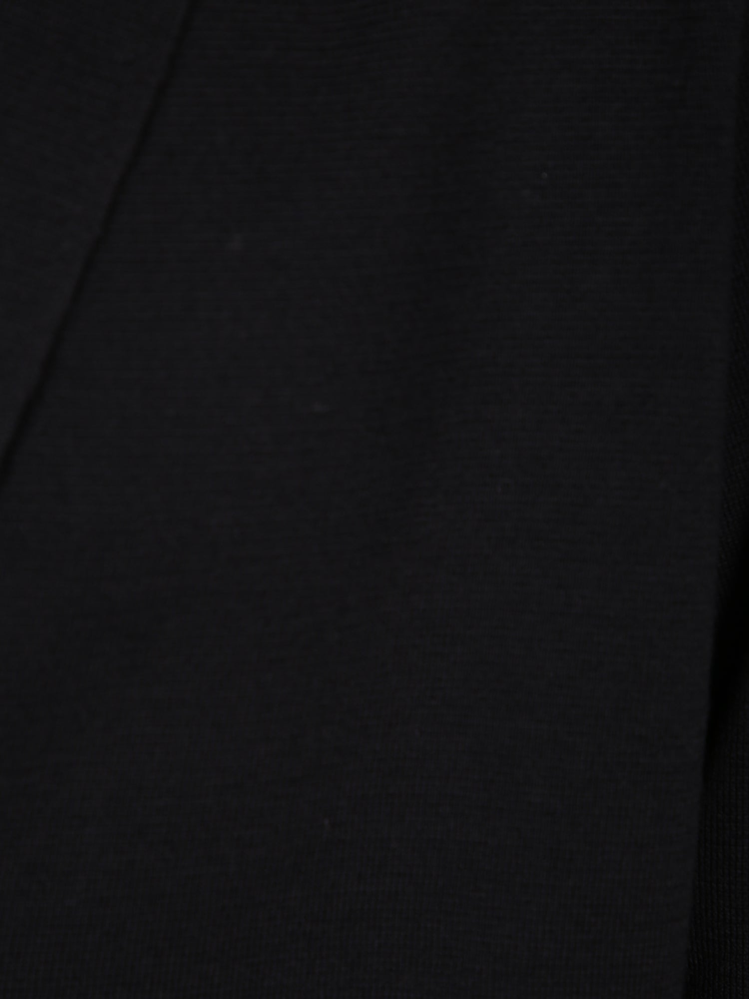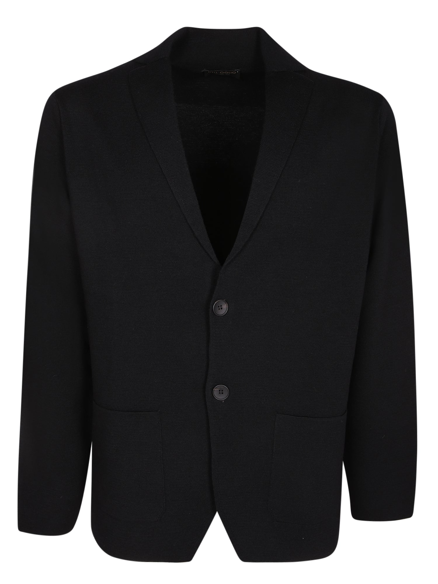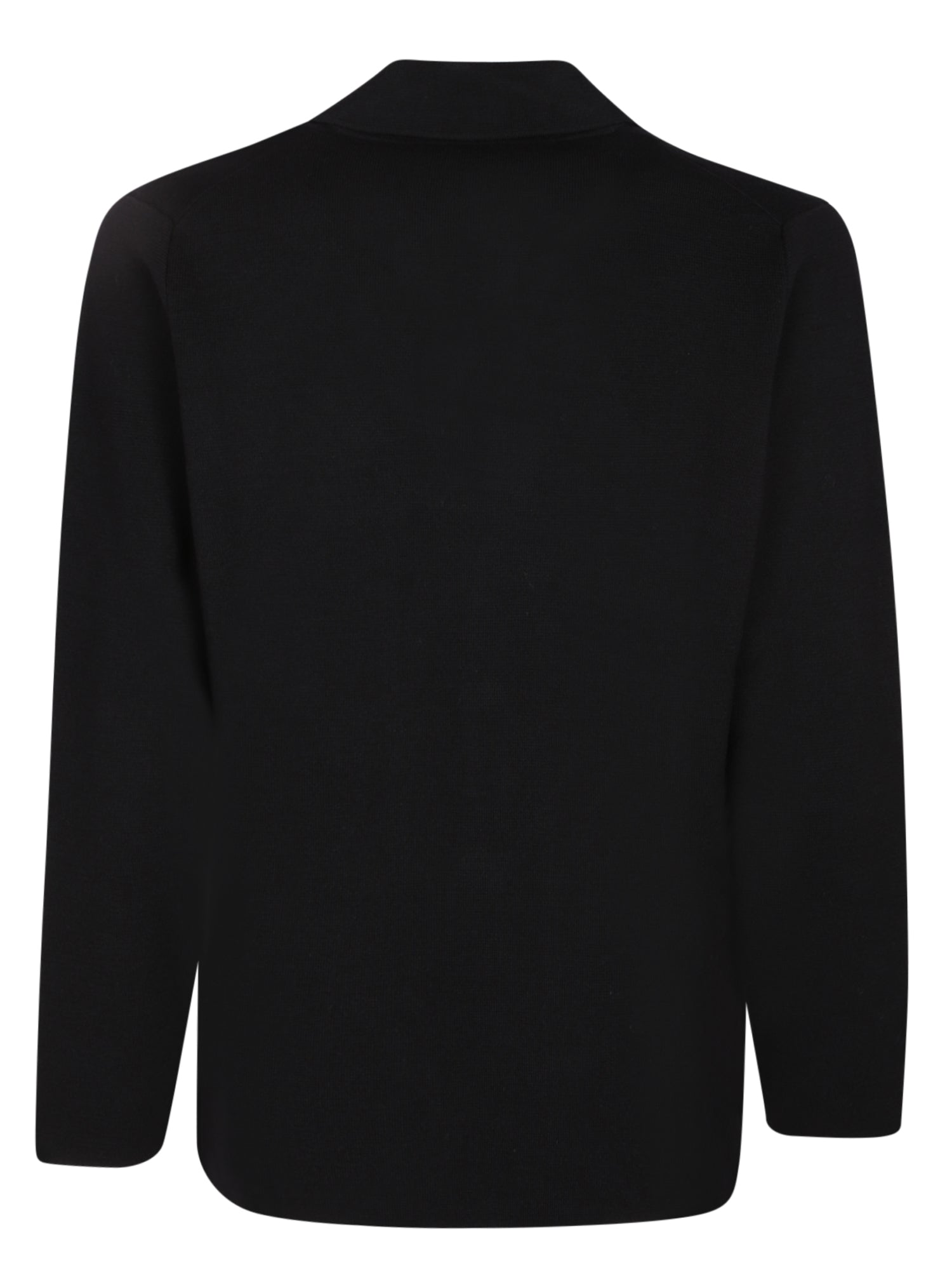 Long-sleeve black fabric cardigan. Features a three-button design, shawl collar, and two front welt pockets.