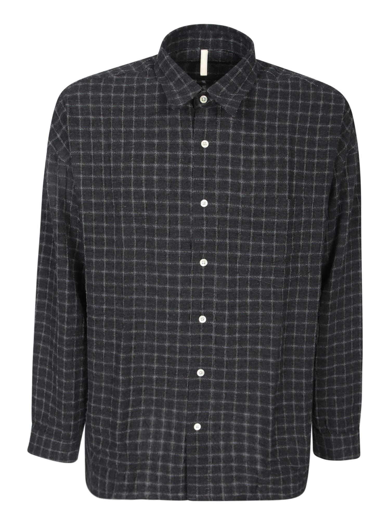 Long sleeves, checkered pattern, front button closure.