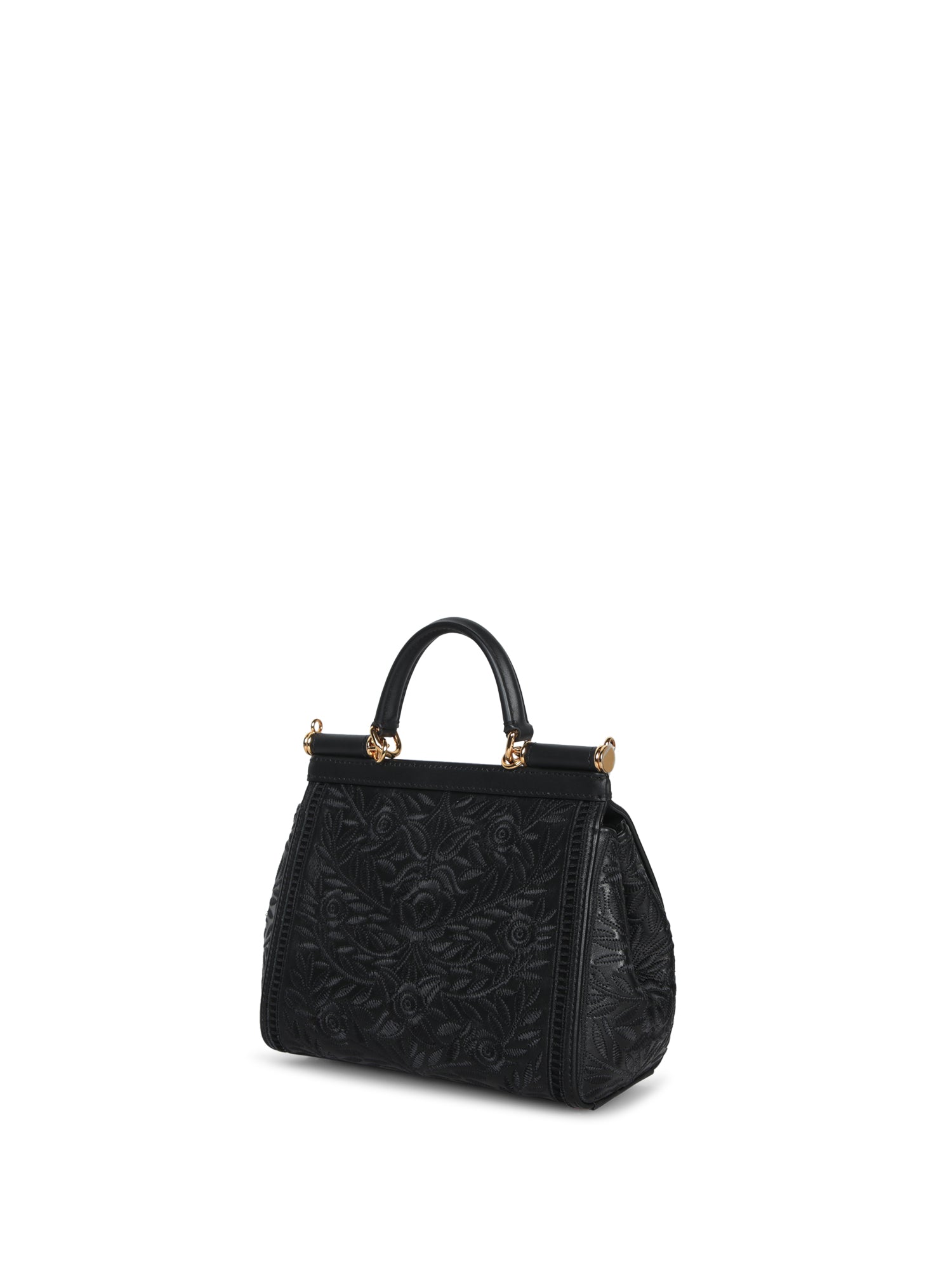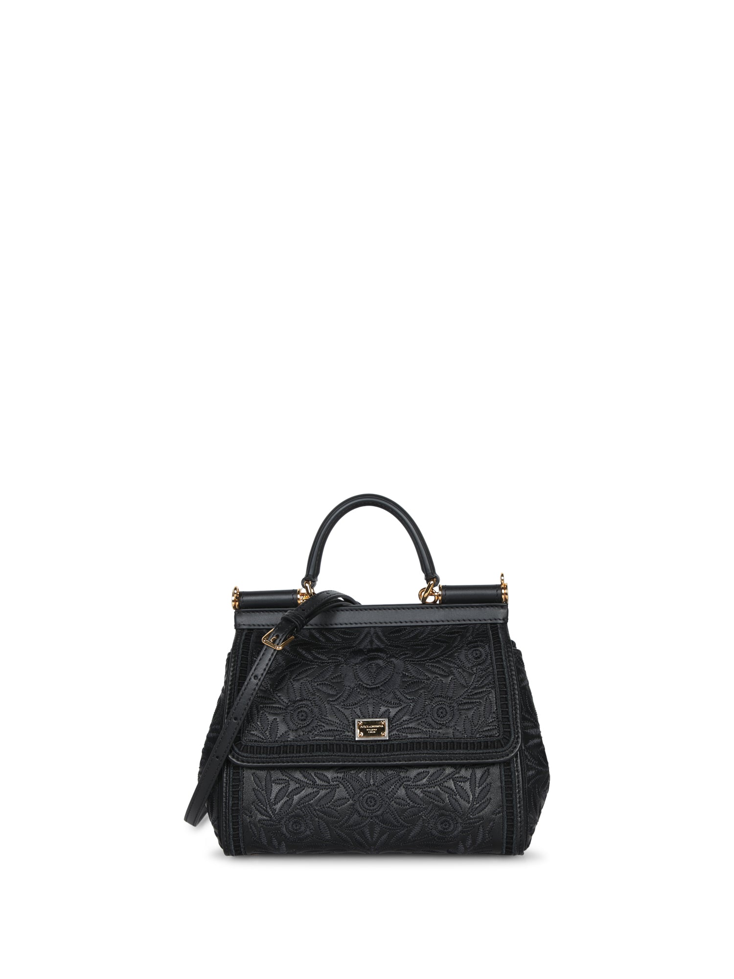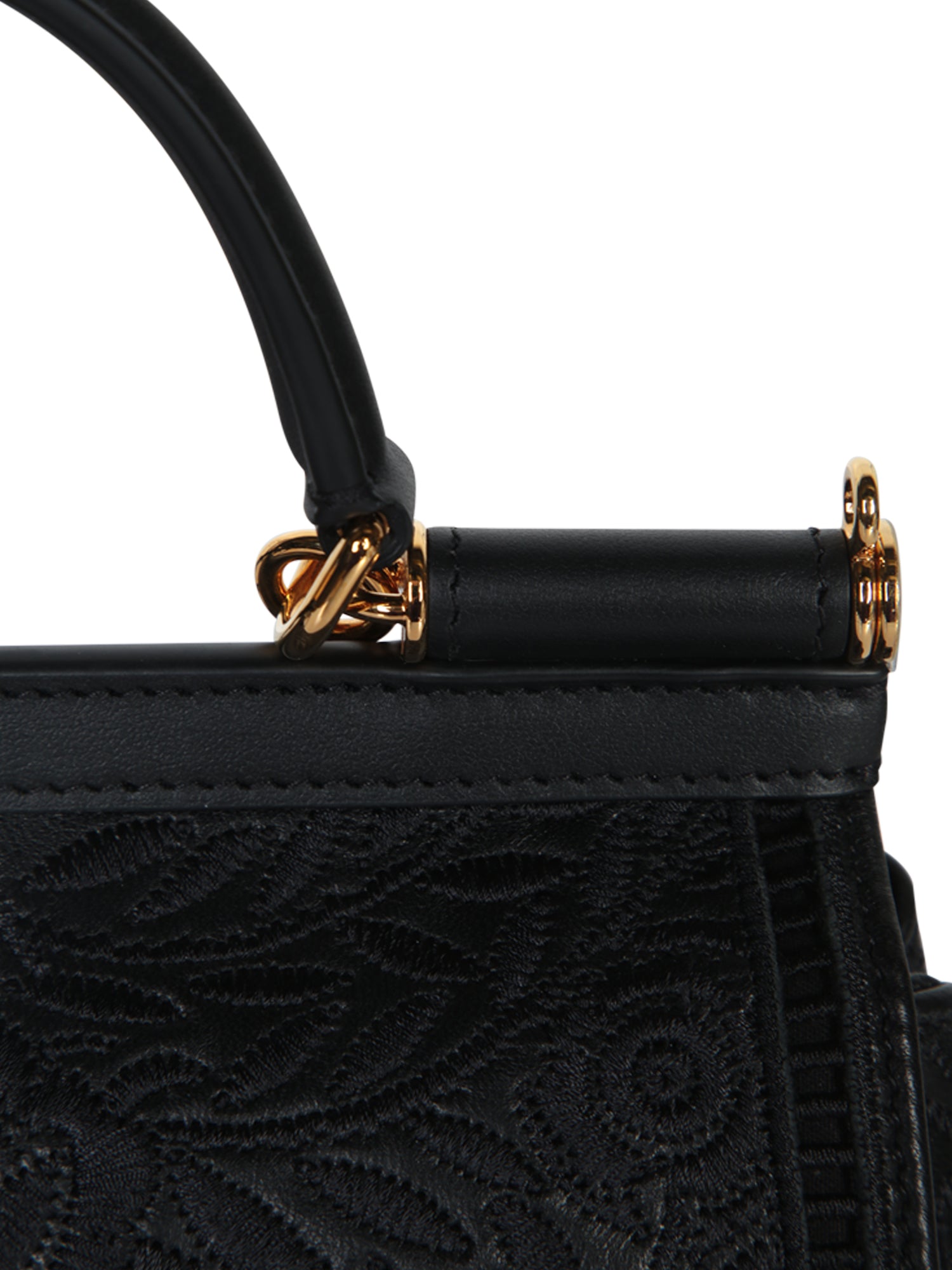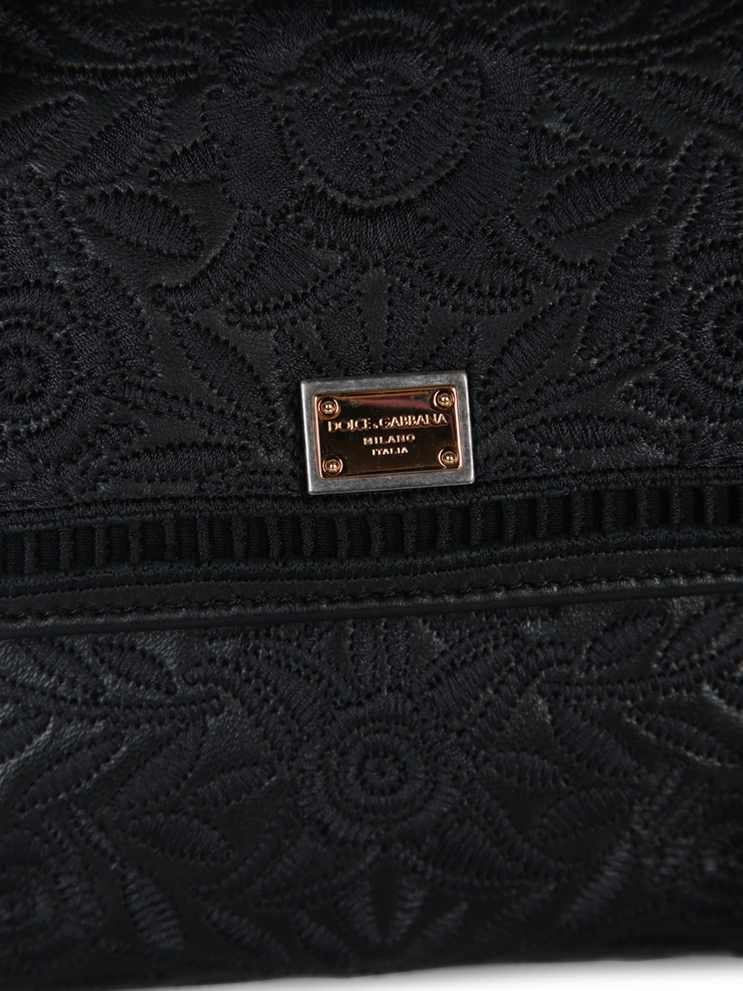 Dolce & Gabbana's Sicily Bag stands out with its intricate black leather embroidery, enhanced by golden hardware and a practical snap closure ensuring both security and style.