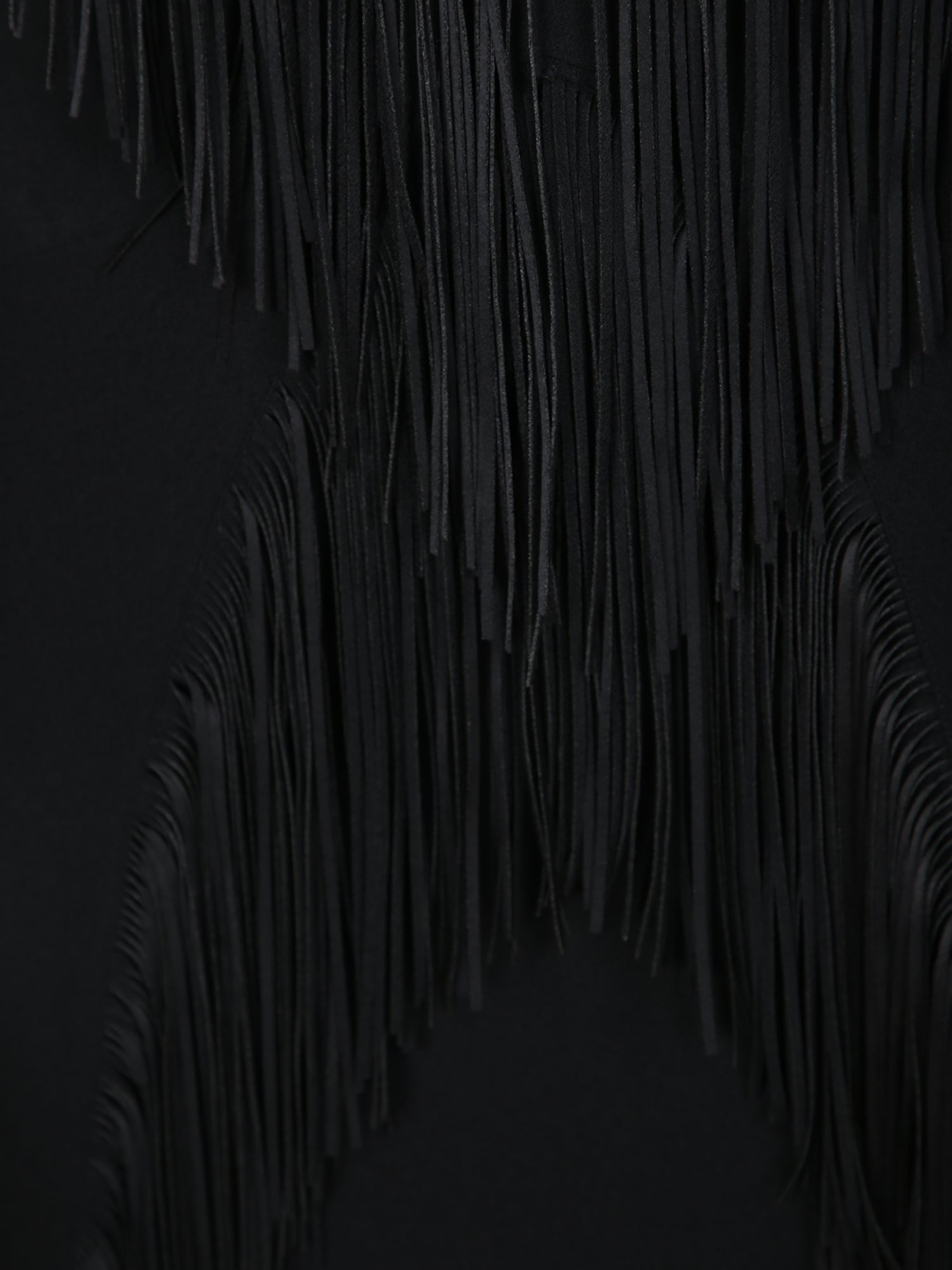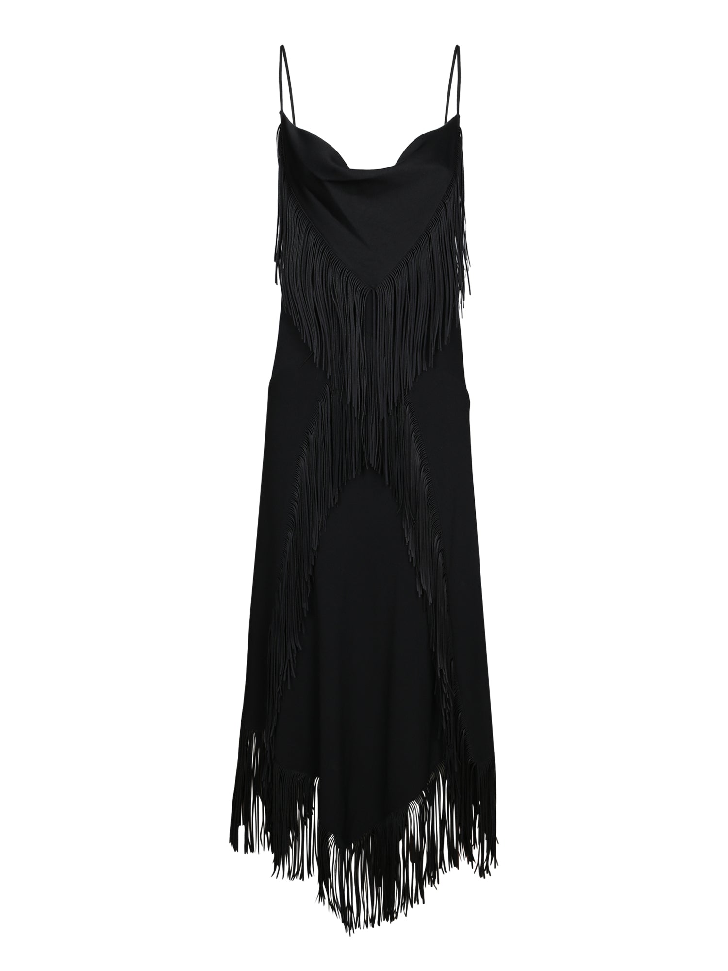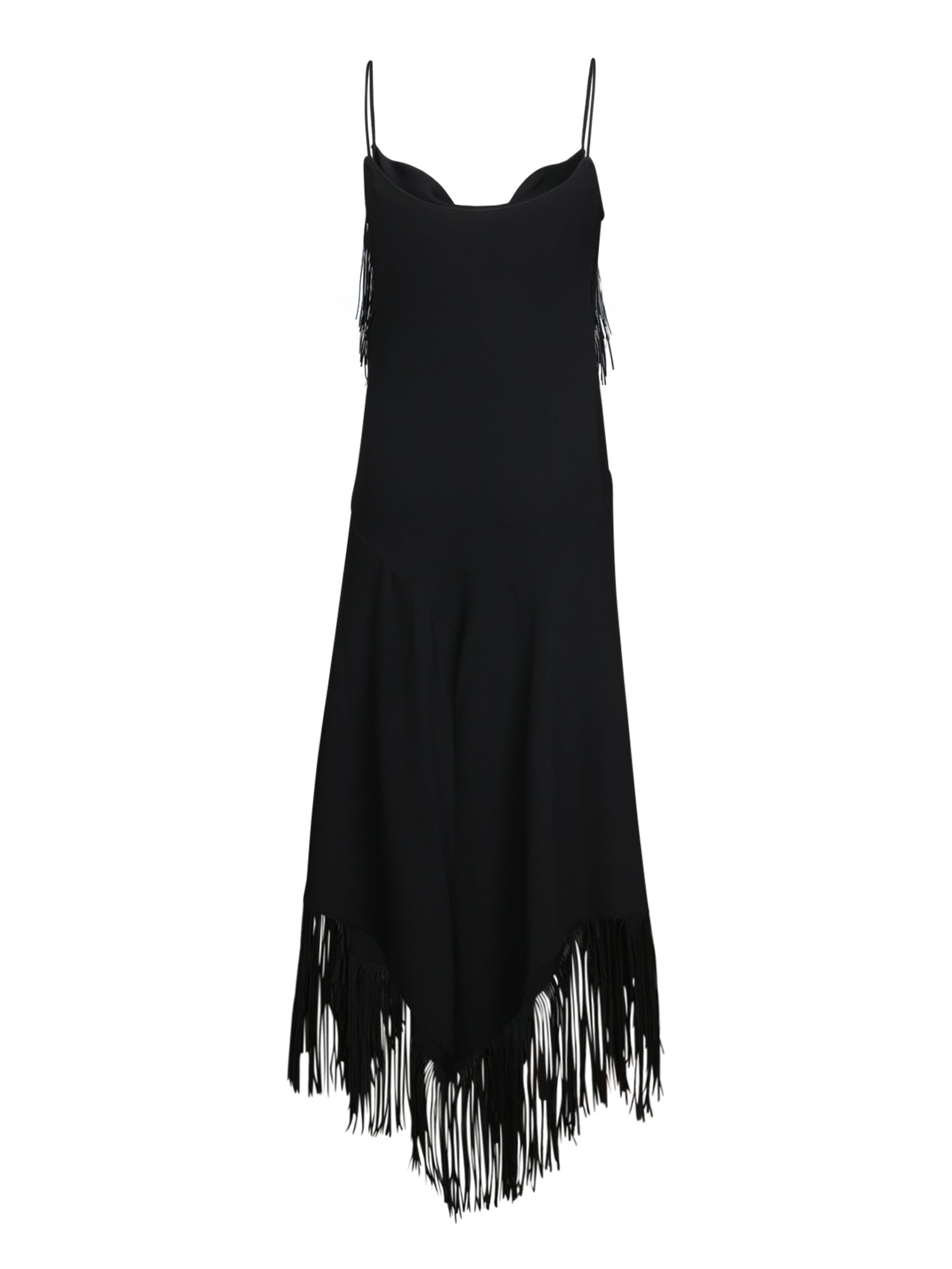 A captivating dress by PACO RABANNE, finished with elegant fabric fringes that add dynamic movement to the silhouette. The minimalist design and black hue make it a versatile piece for evening affairs.