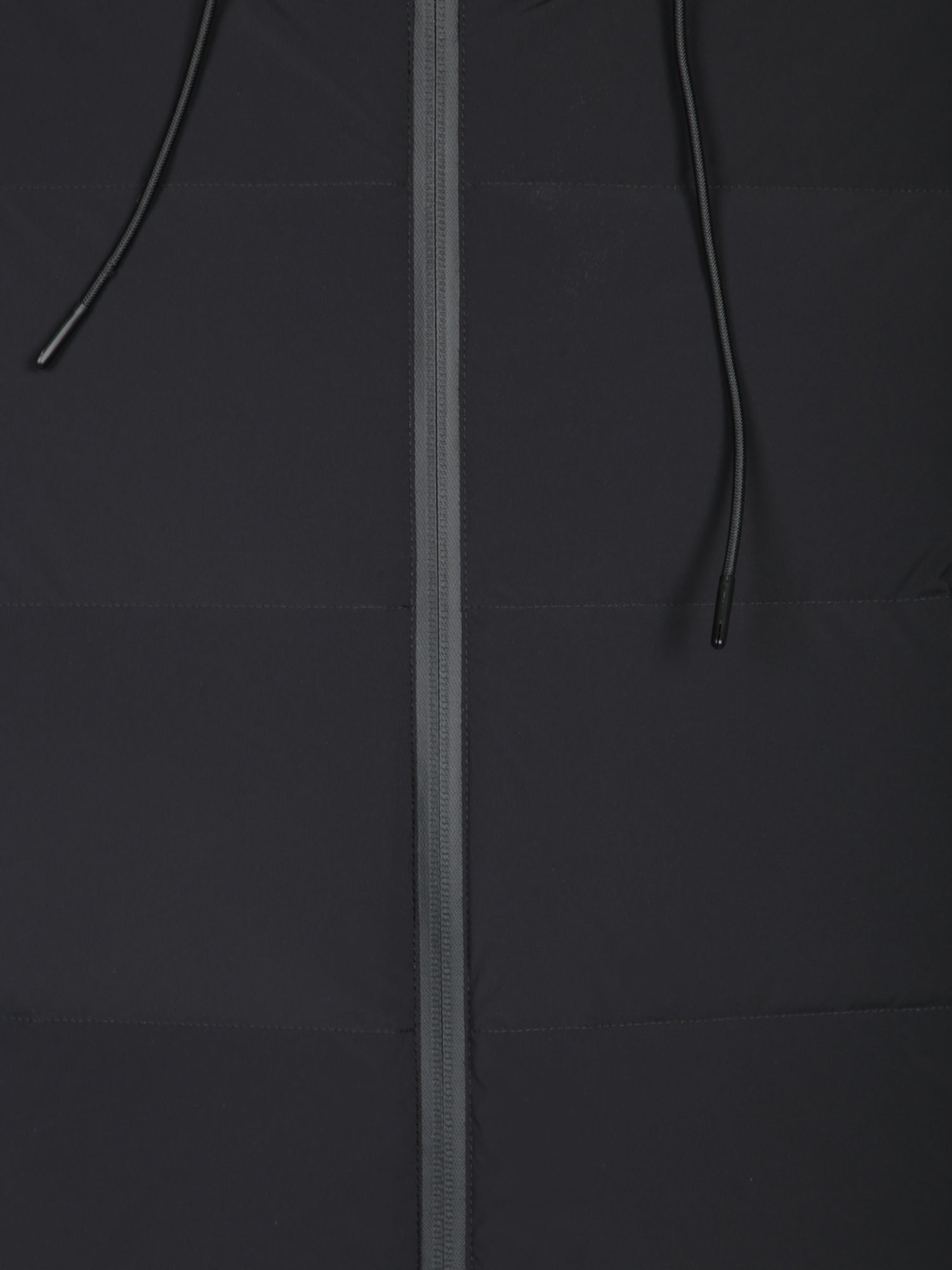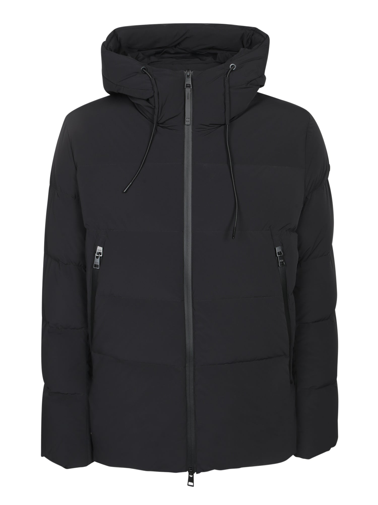 Down-filled jacket with hood, front zipper closure, side zipper pockets.
