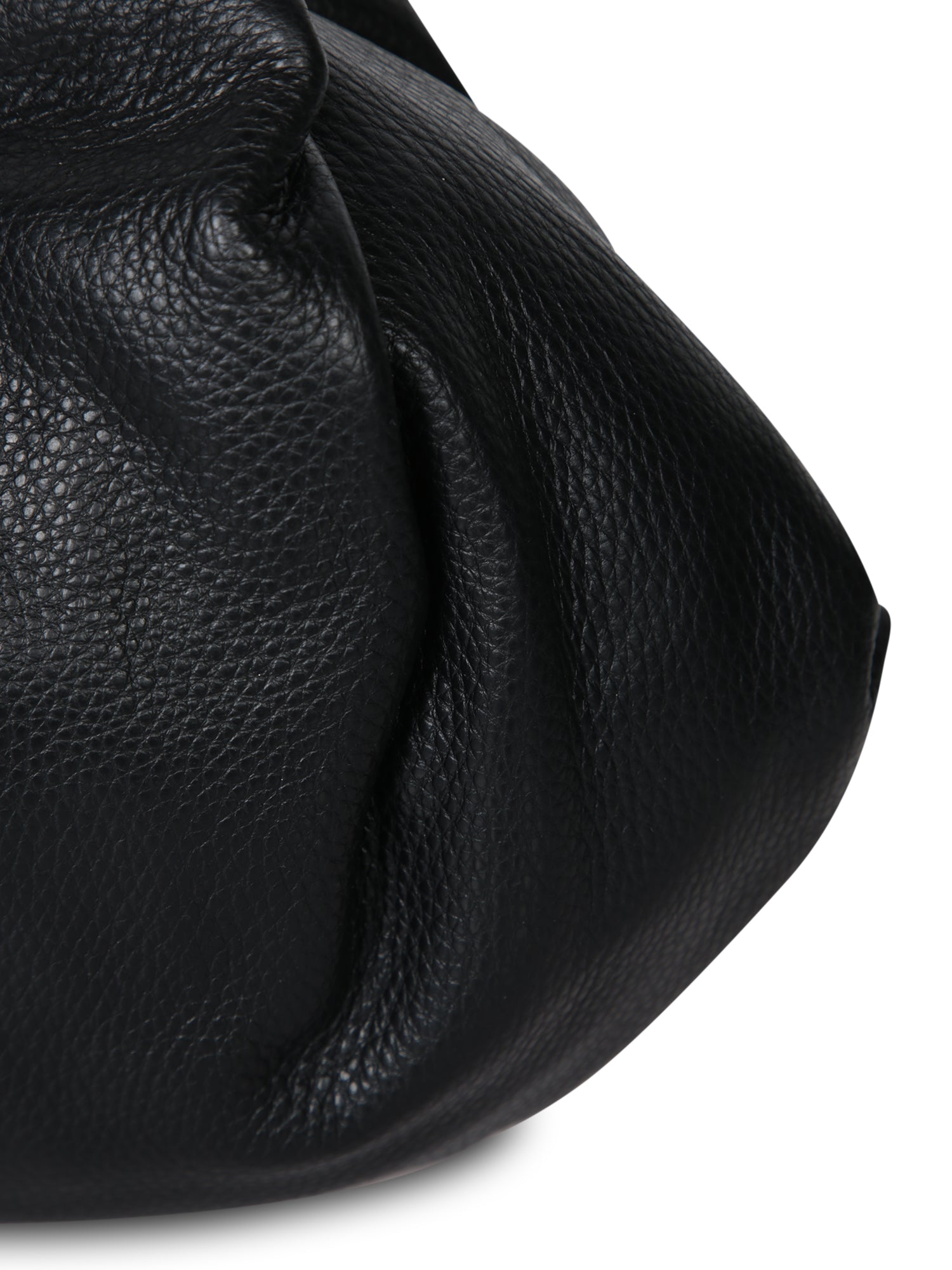 Black leather bag with draped design. Magnetic snap top closure. Lined interior with pocket.