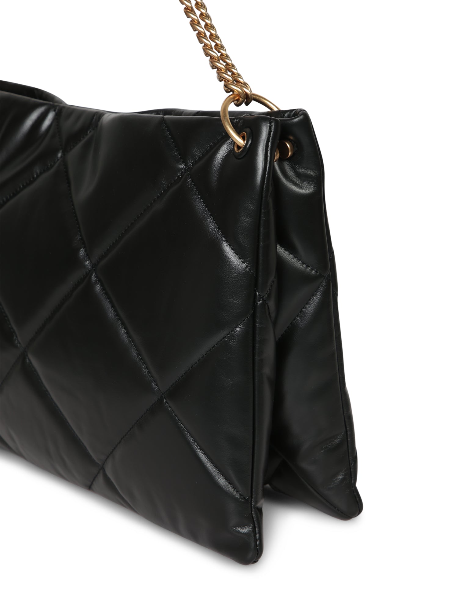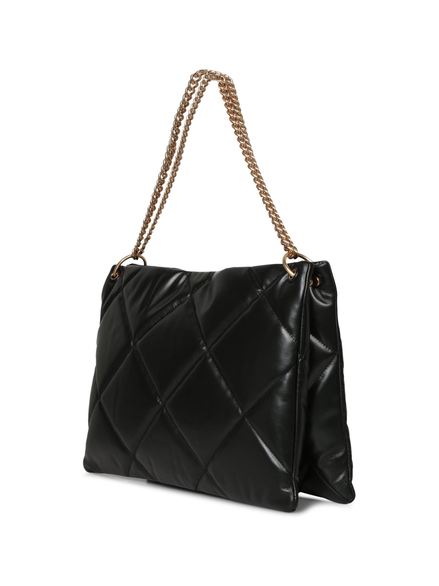 Black leather bag. Gold chain shoulder strap. Gold logo closure.