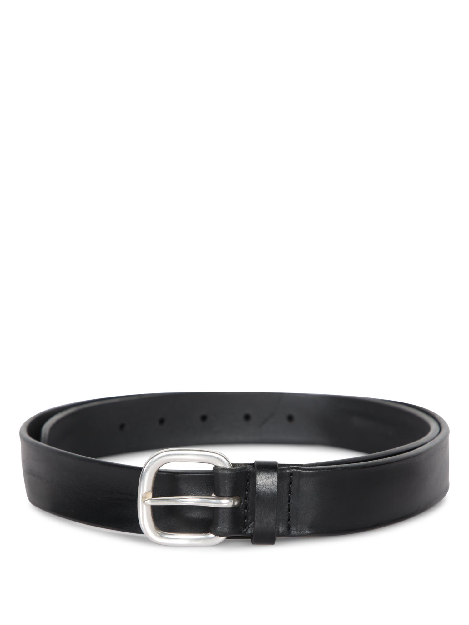 Soft black leather belt with a silver-tone metal buckle. Tone-on-tone stitching. Single loop.