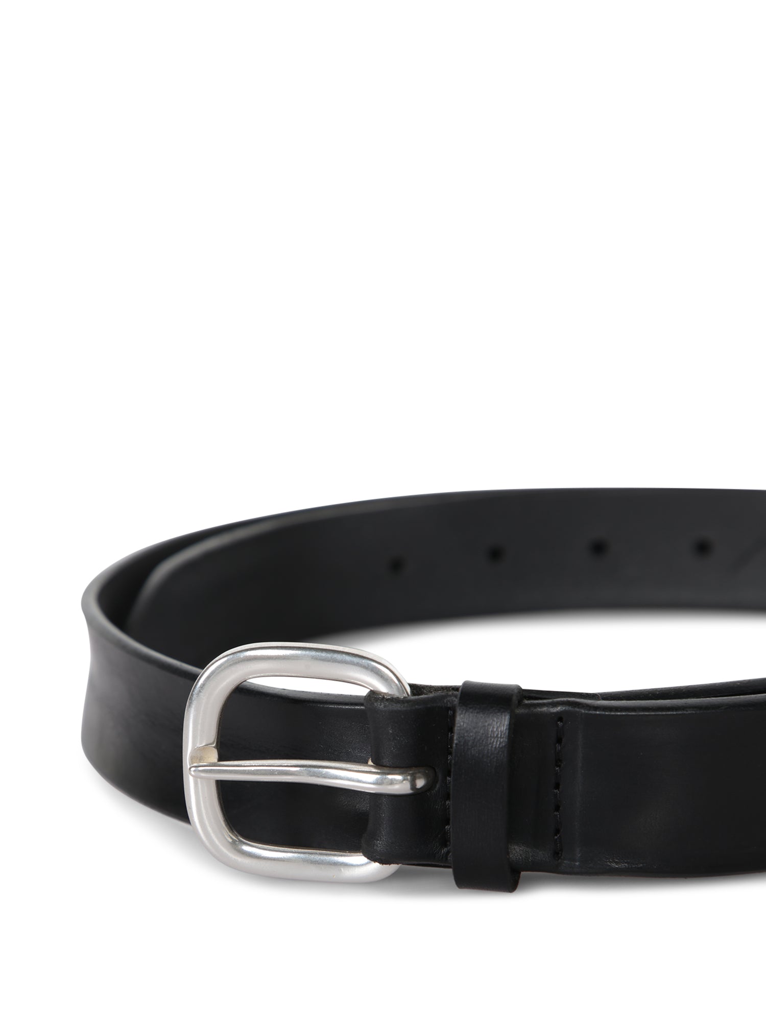 Soft black leather belt with a silver-tone metal buckle. Tone-on-tone stitching. Single loop.