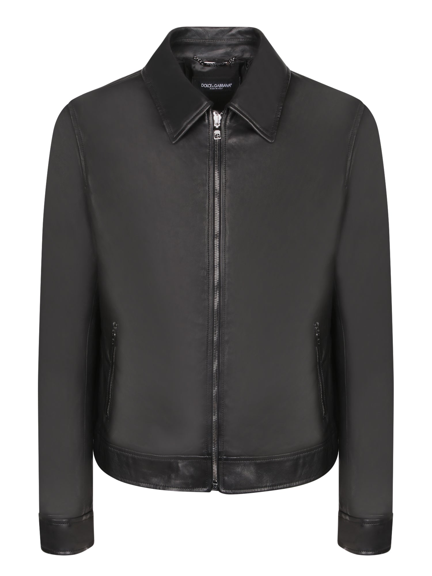 Smooth leather jacket. Front zip closure. Classic collar. Snap button cuffs. Side pockets.