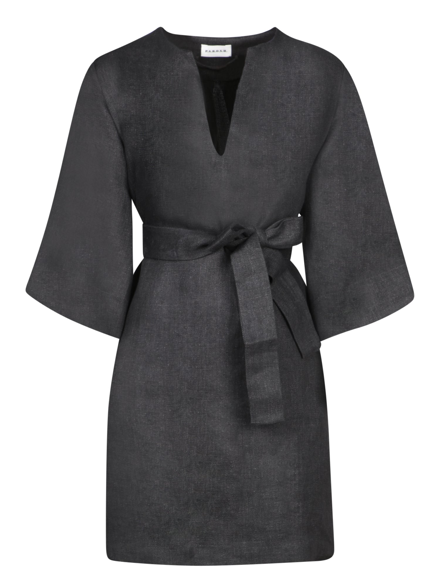 Three-quarter sleeves, V-neckline, coordinated belt.