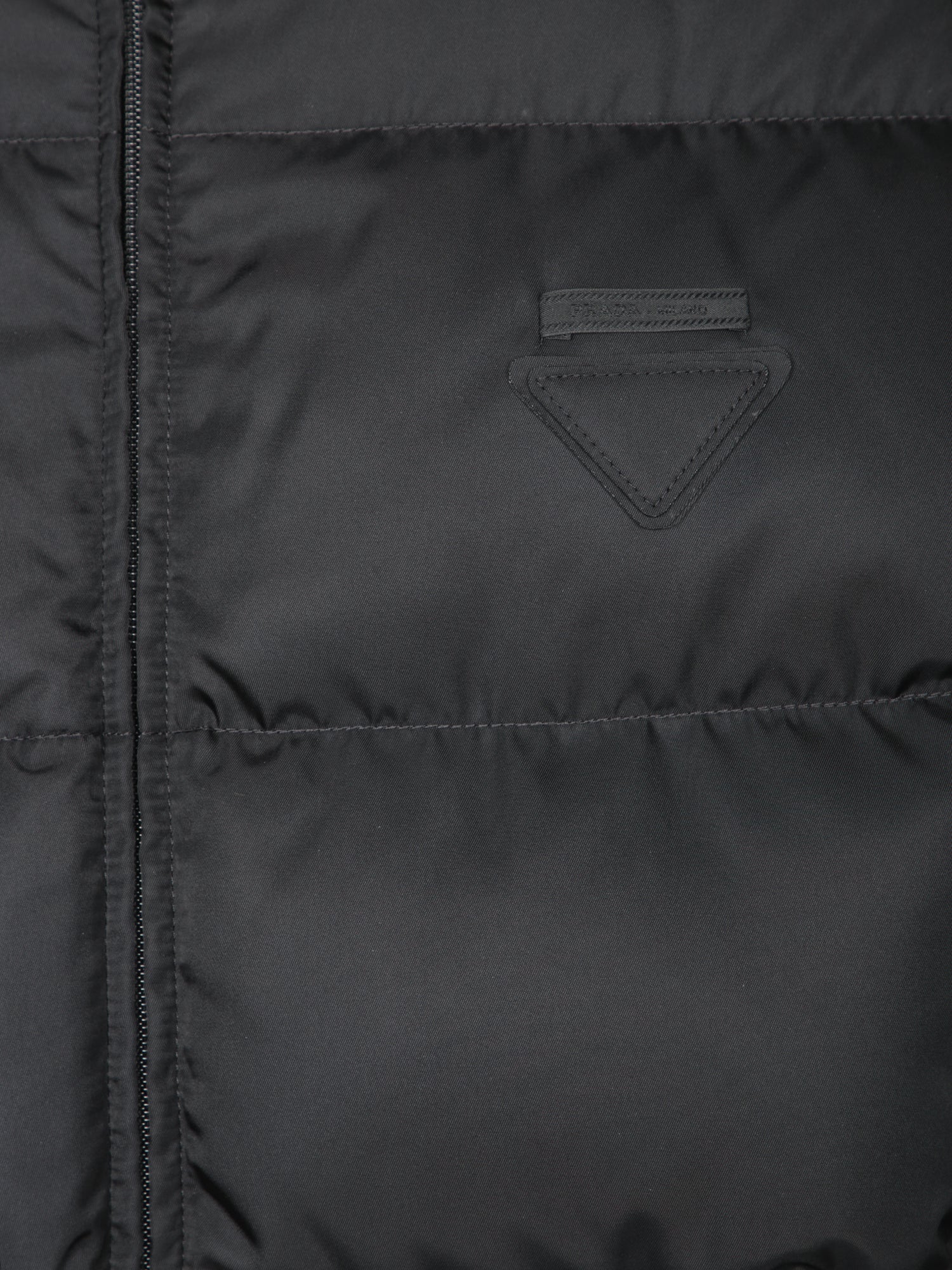 Padded down jacket with waterproof technical fabric coating. Front zip closure. High collar. Embossed Prada logo on the chest.