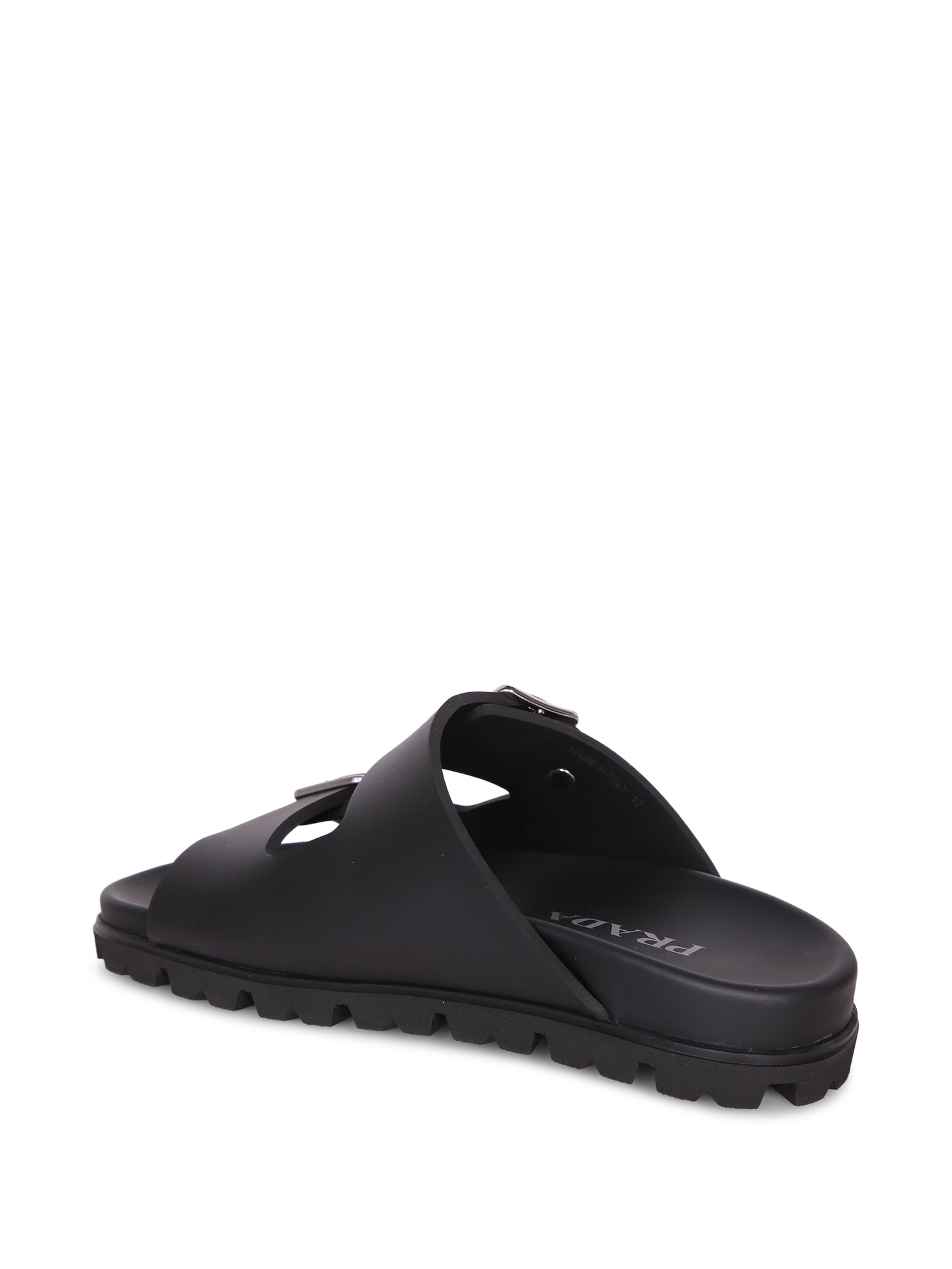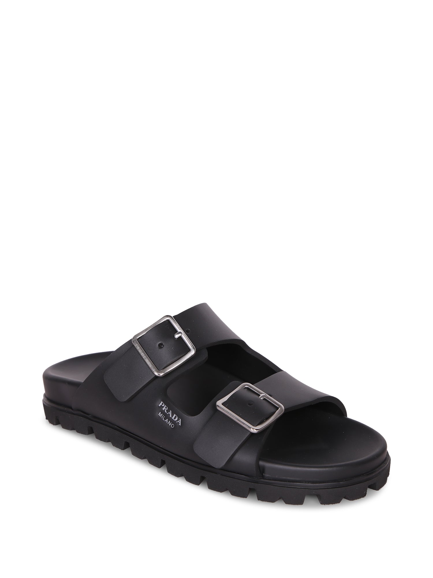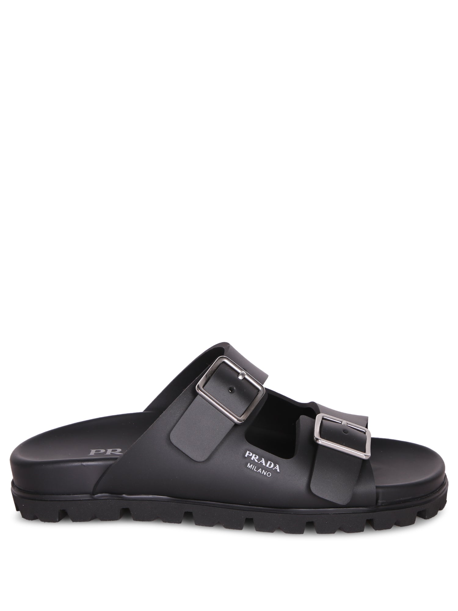 Black rubber sandals with double metal buckle. Striped non-slip sole. Embossed Prada Milano logo.