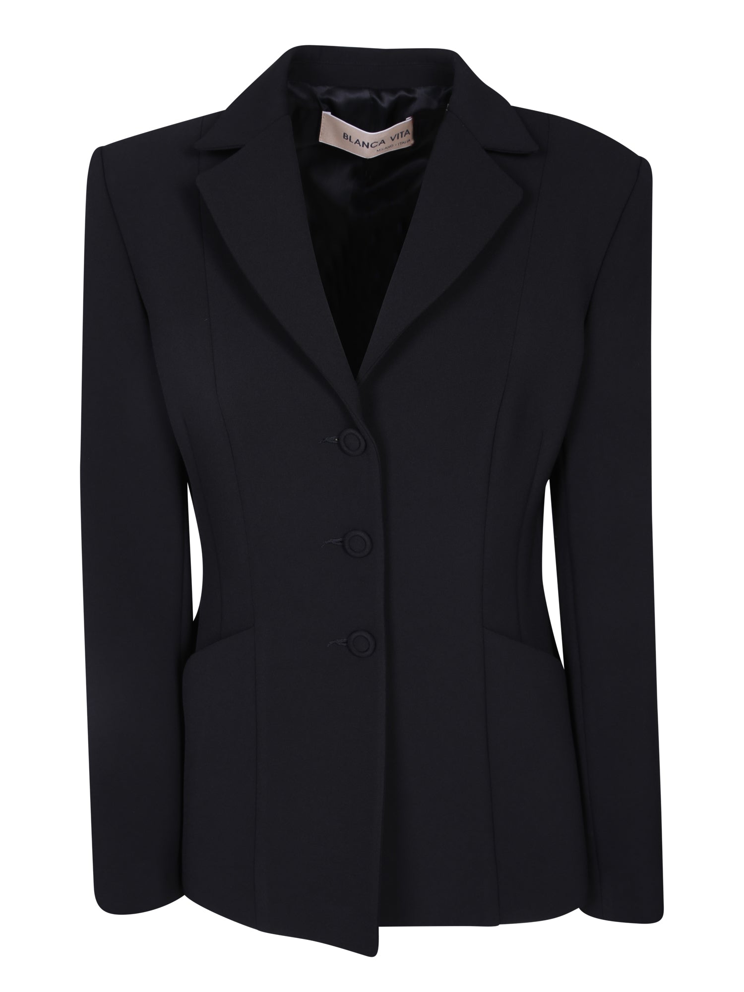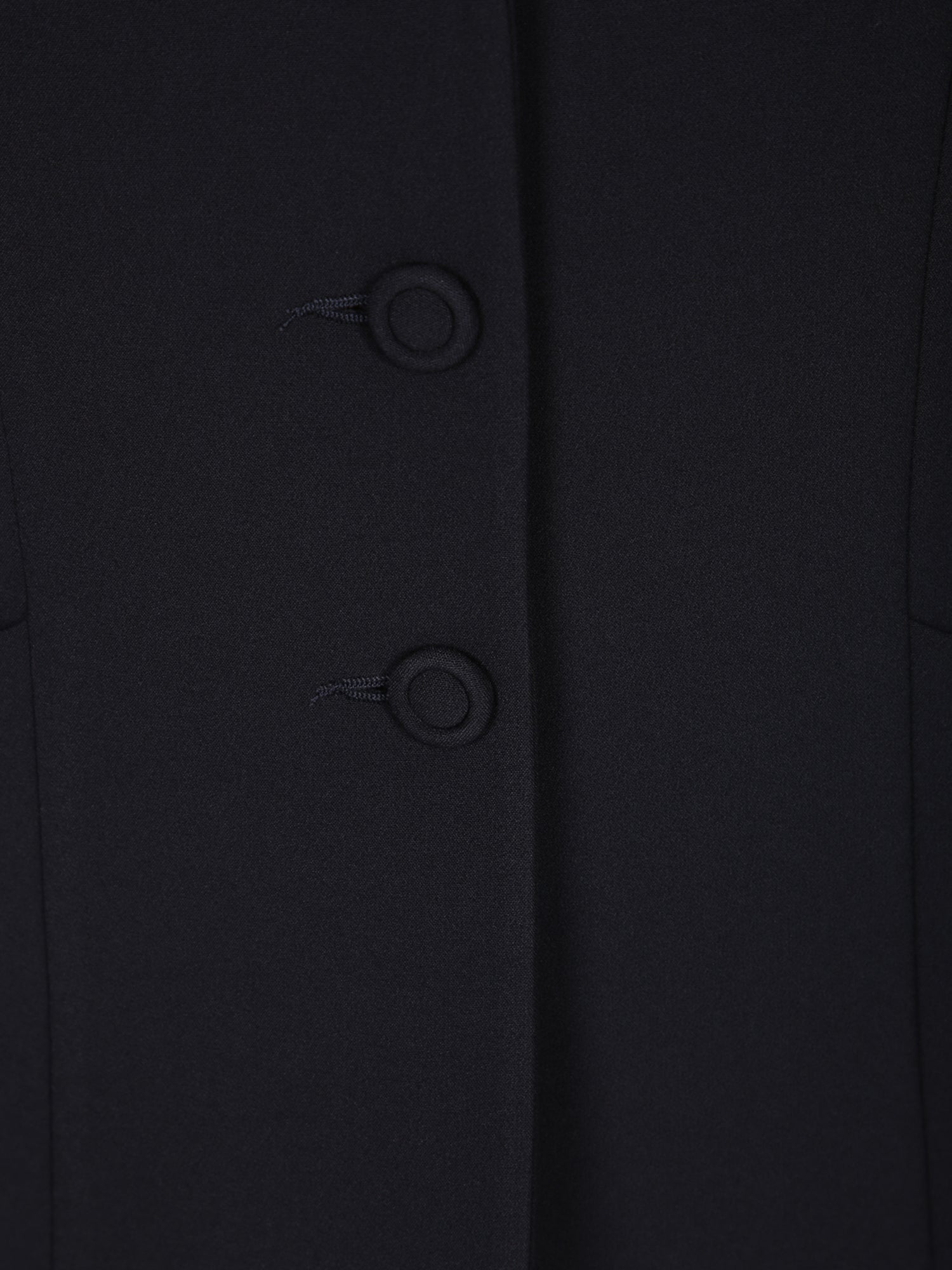 Single-breasted jacket in stretch crepe fabric. Three frontal buttons. Side welt pockets.