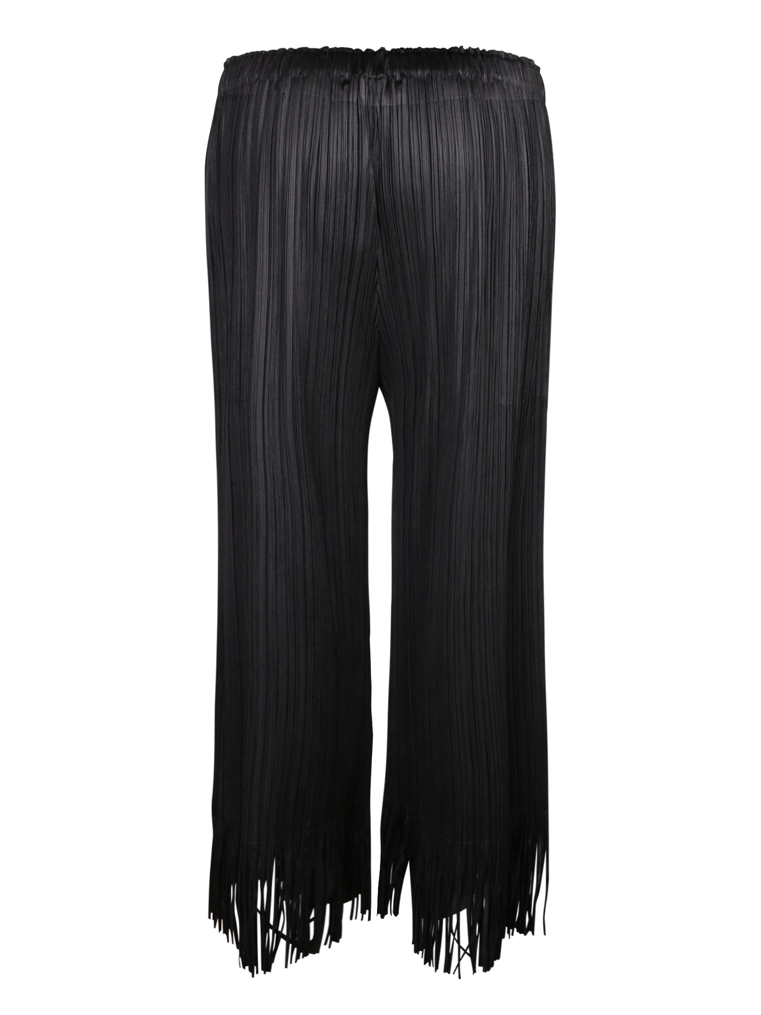 Black trousers featuring a wave design and fringes at the lower edge. Elastic waistband for maximum comfort.