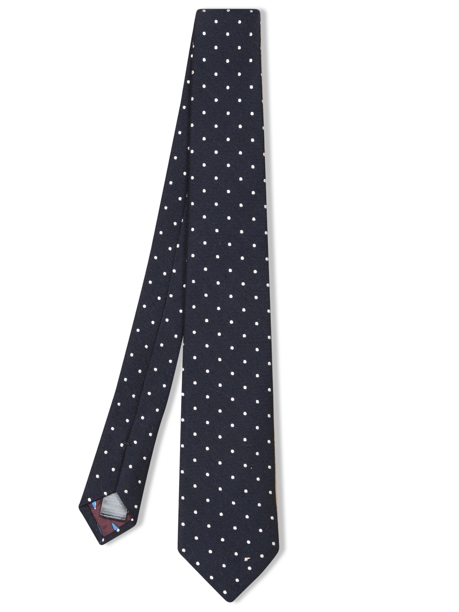 Elegant Paul Smith silk tie featuring an irresistible white polka dot pattern on a black background, perfect for adding a touch of class to any formal outfit.