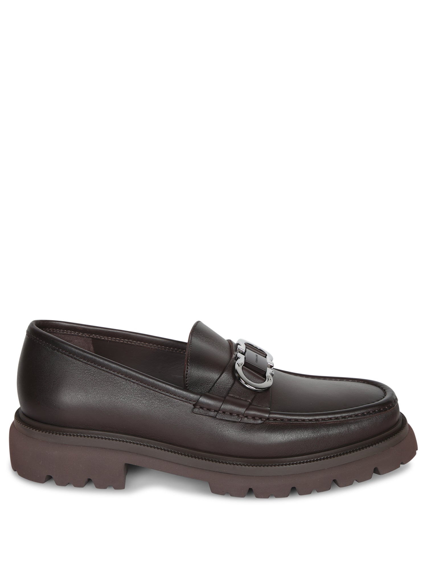 This elegant Ferragamo loafer, crafted in fine dark brown leather, is enhanced with a distinctive silver Gancini buckle, finished with a sturdy toothed rubber sole for optimal grip.