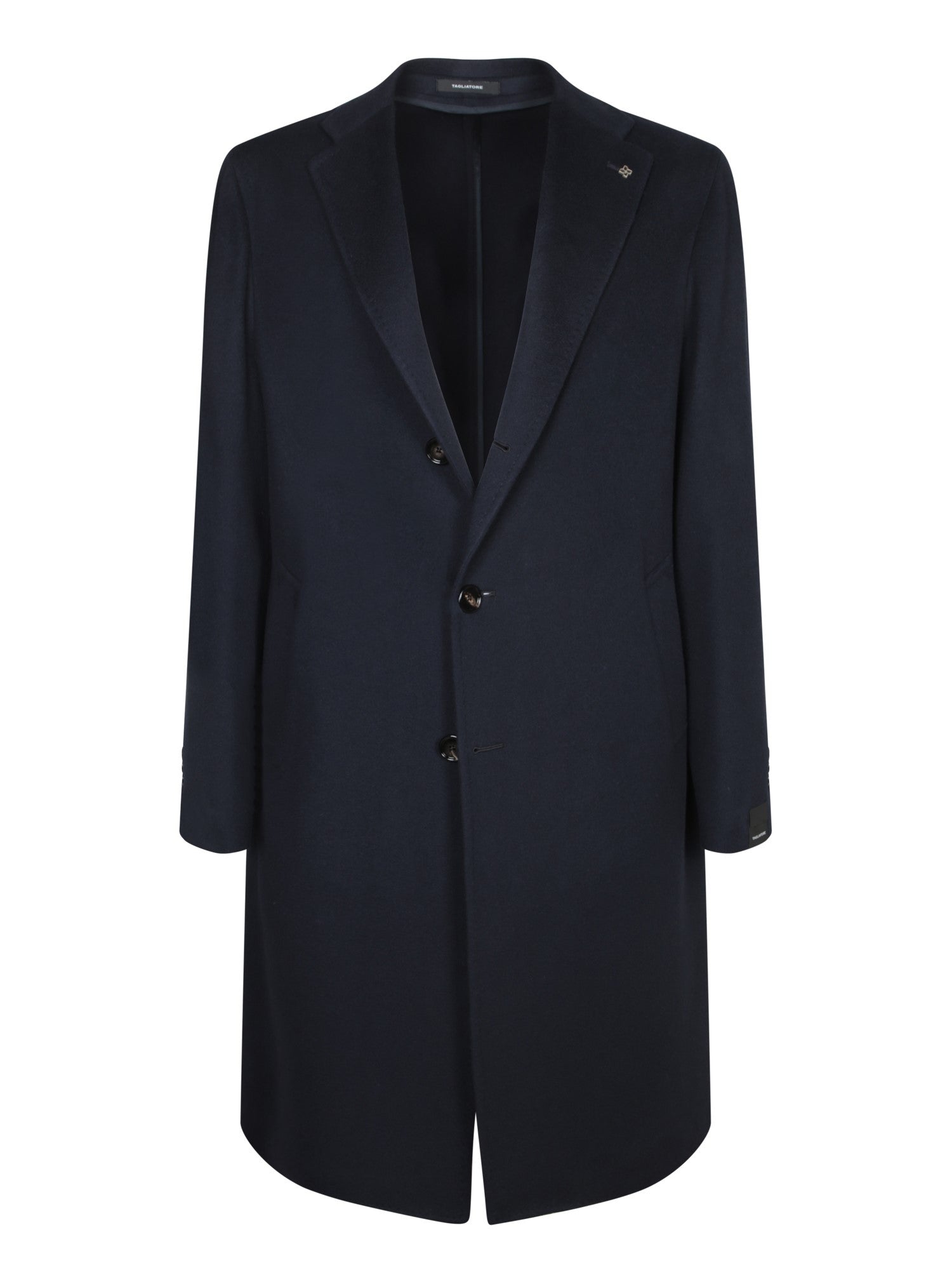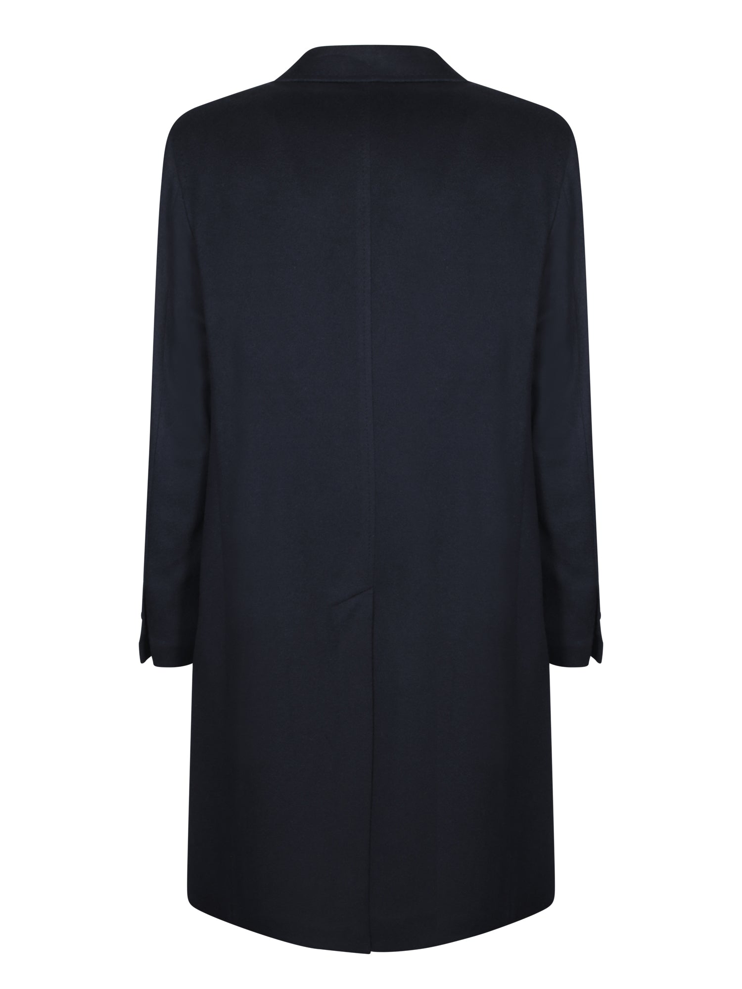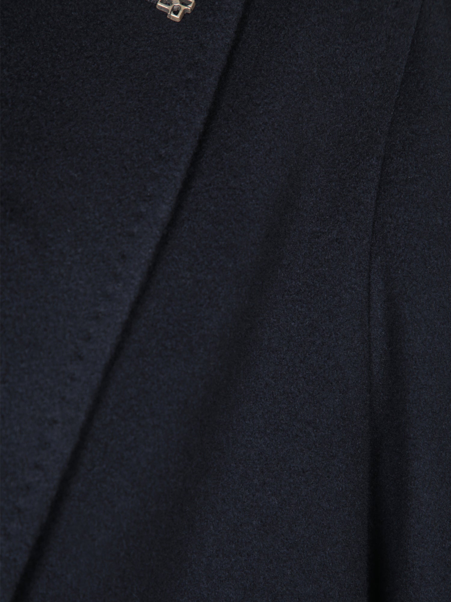 Long coat with two-button closure. Classic lapels. Welt pockets.