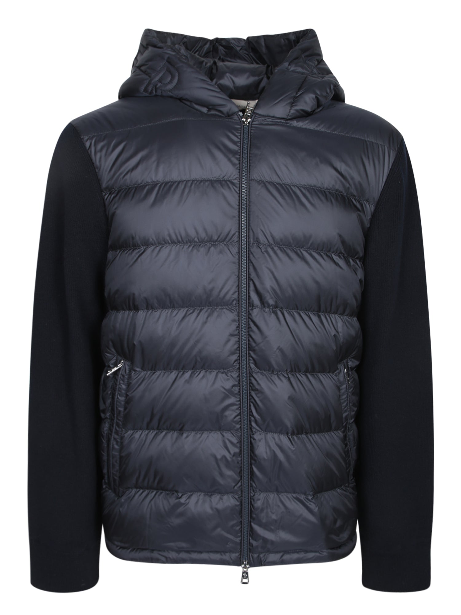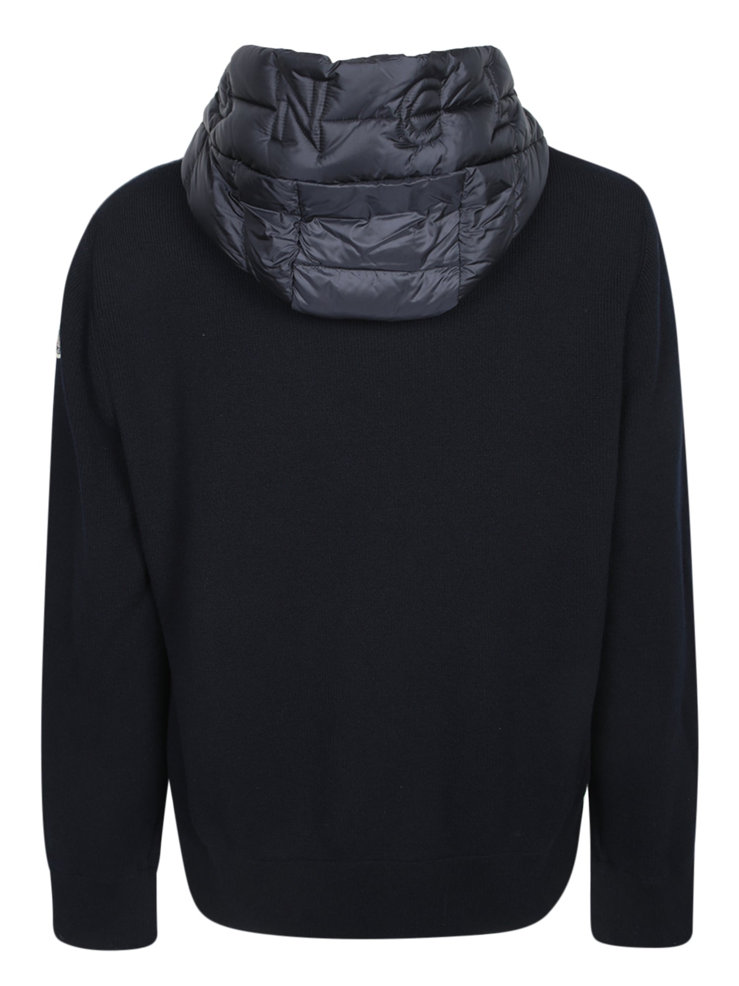 Cardigan with stretch technical fabric sleeves. Integrated hood. Front zip closure. Side zip pockets.
