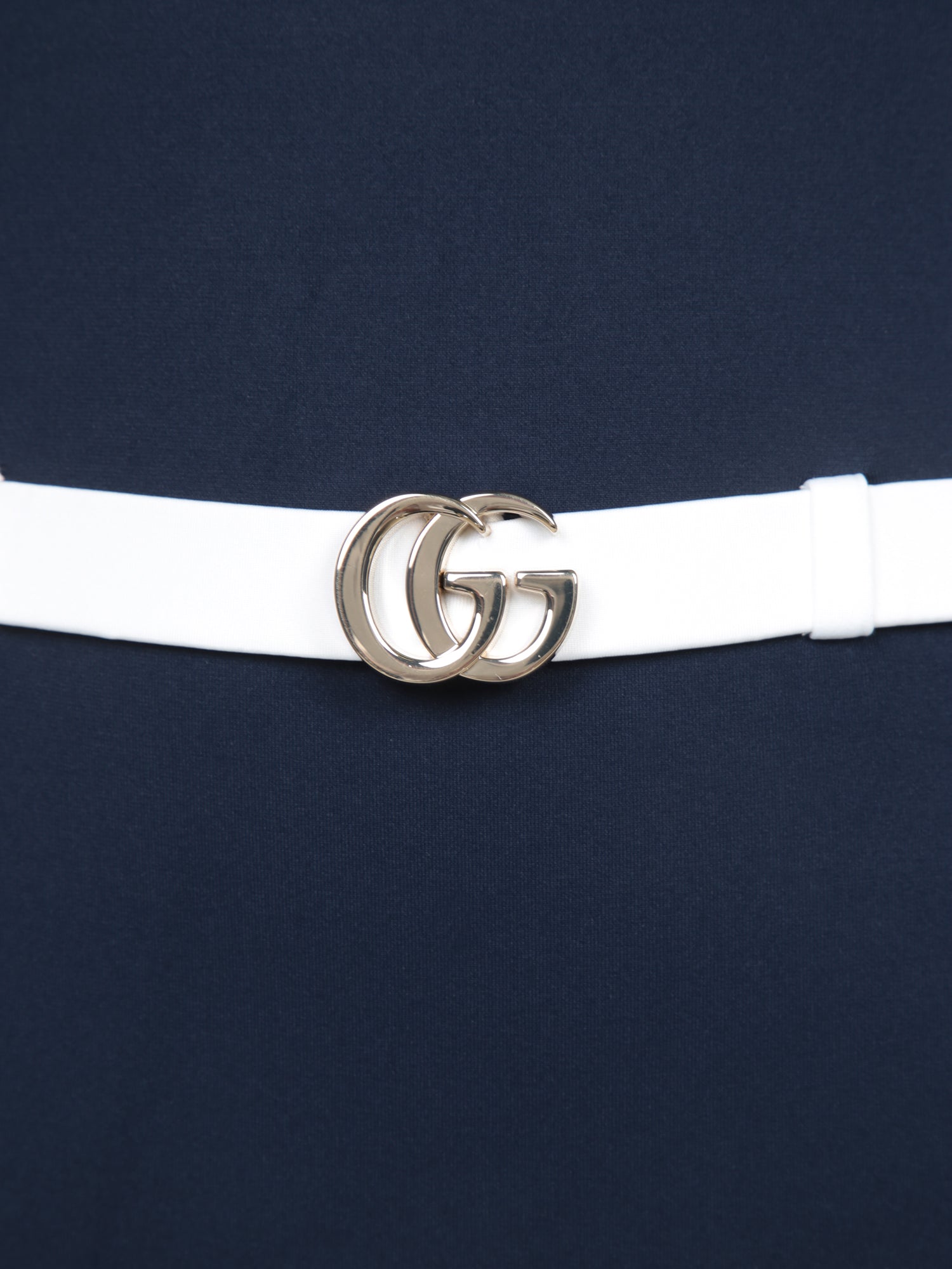 One-piece swimsuit with white belt. White contrast trim. Gucci logo on the buckle.