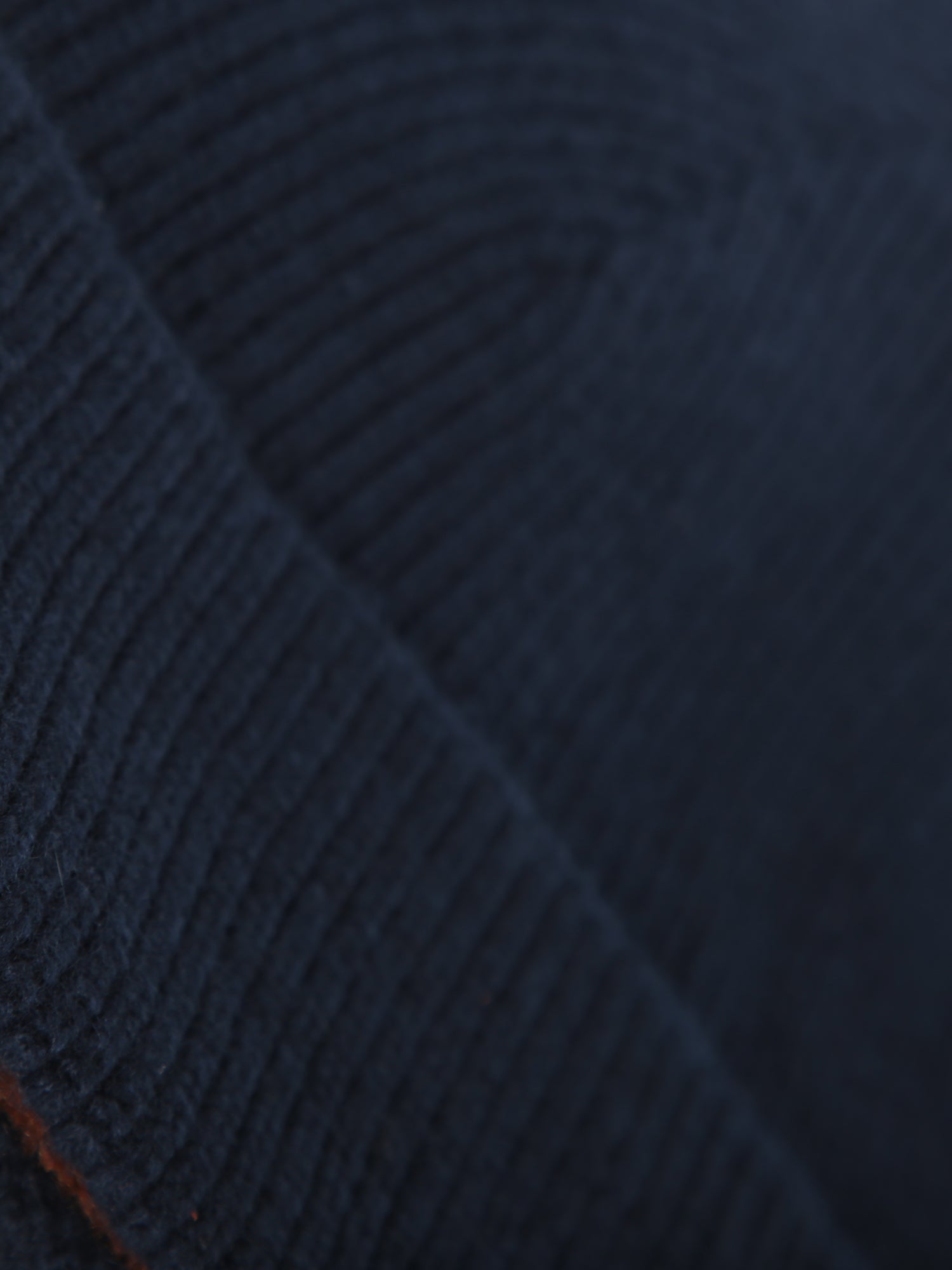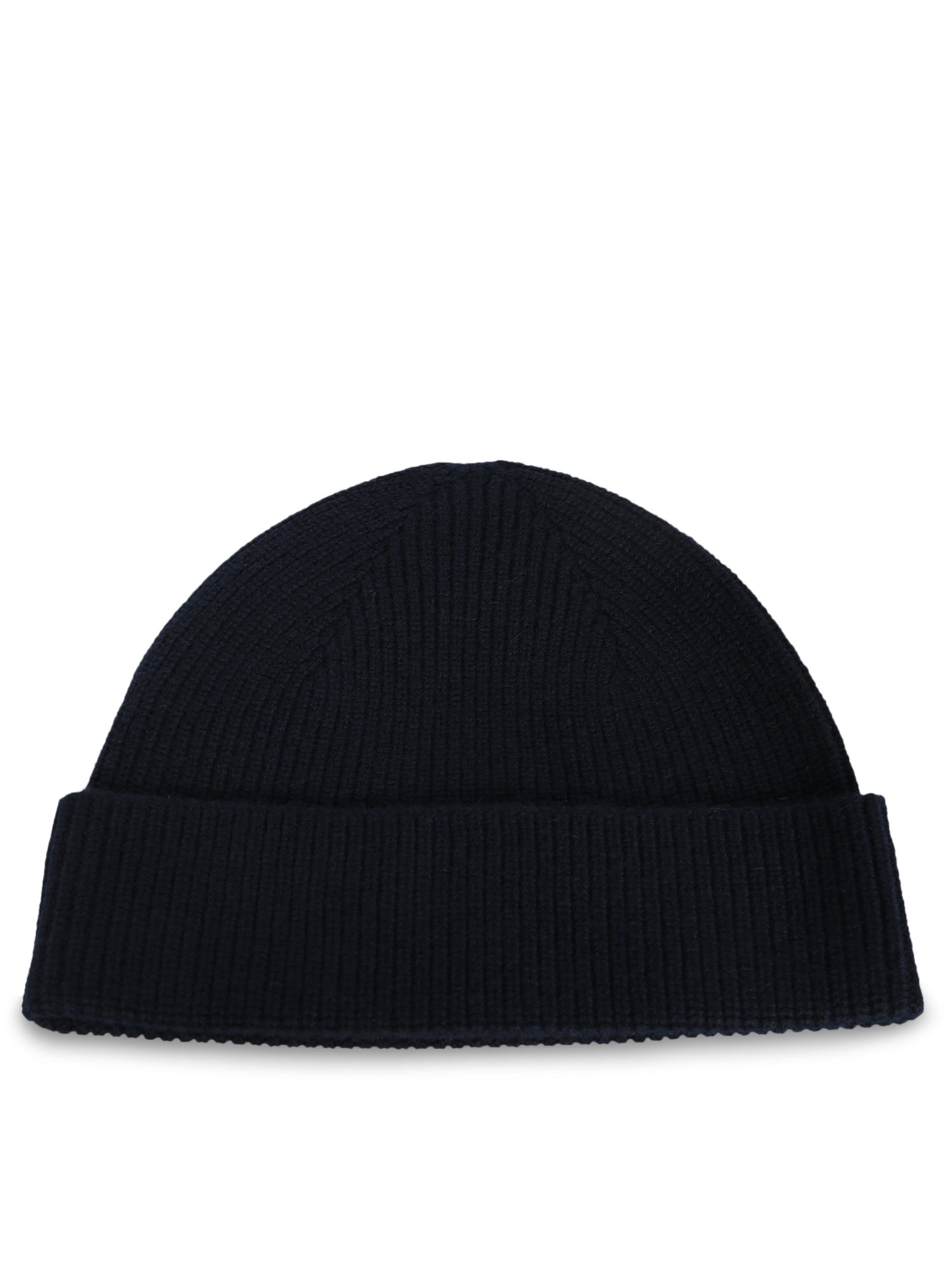 Beanie hat made from fine blue wool. Ribbed design. Fold-over cuff.