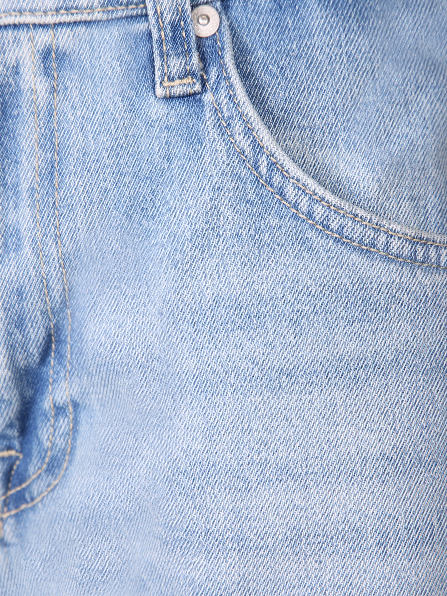 High-waisted jeans with a curvilinear cut. Front button and zip closure. Light washed effect.
