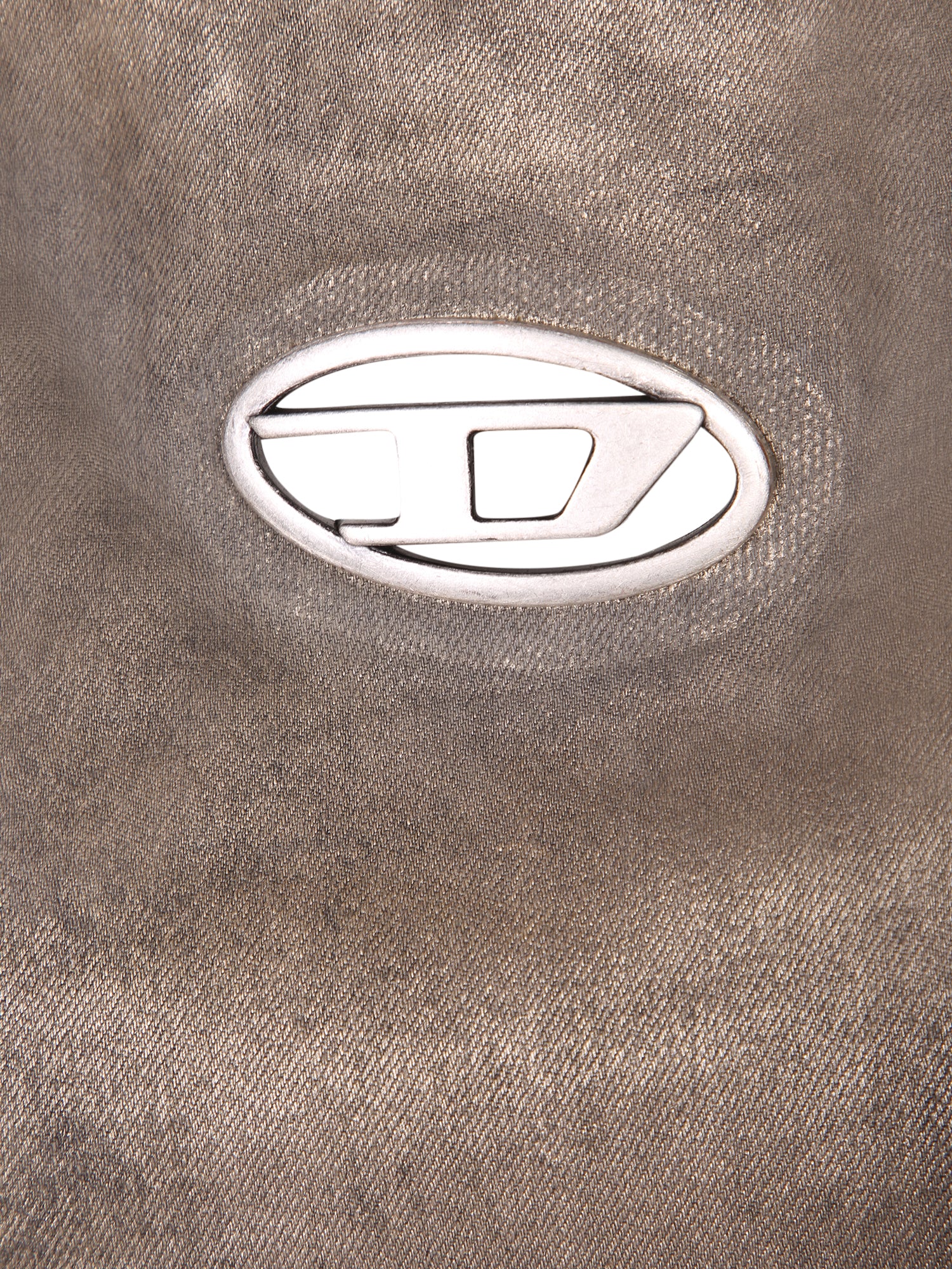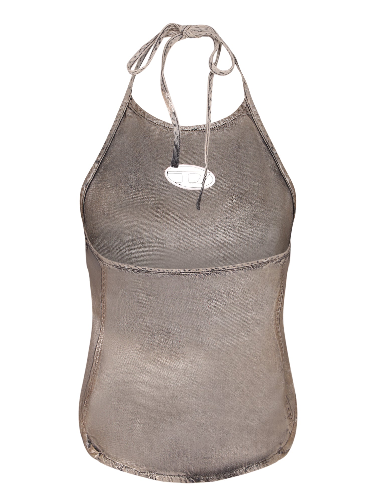 Sleeveless top with a high neck design. Metal logo detail on the front. Metallic coated texture.