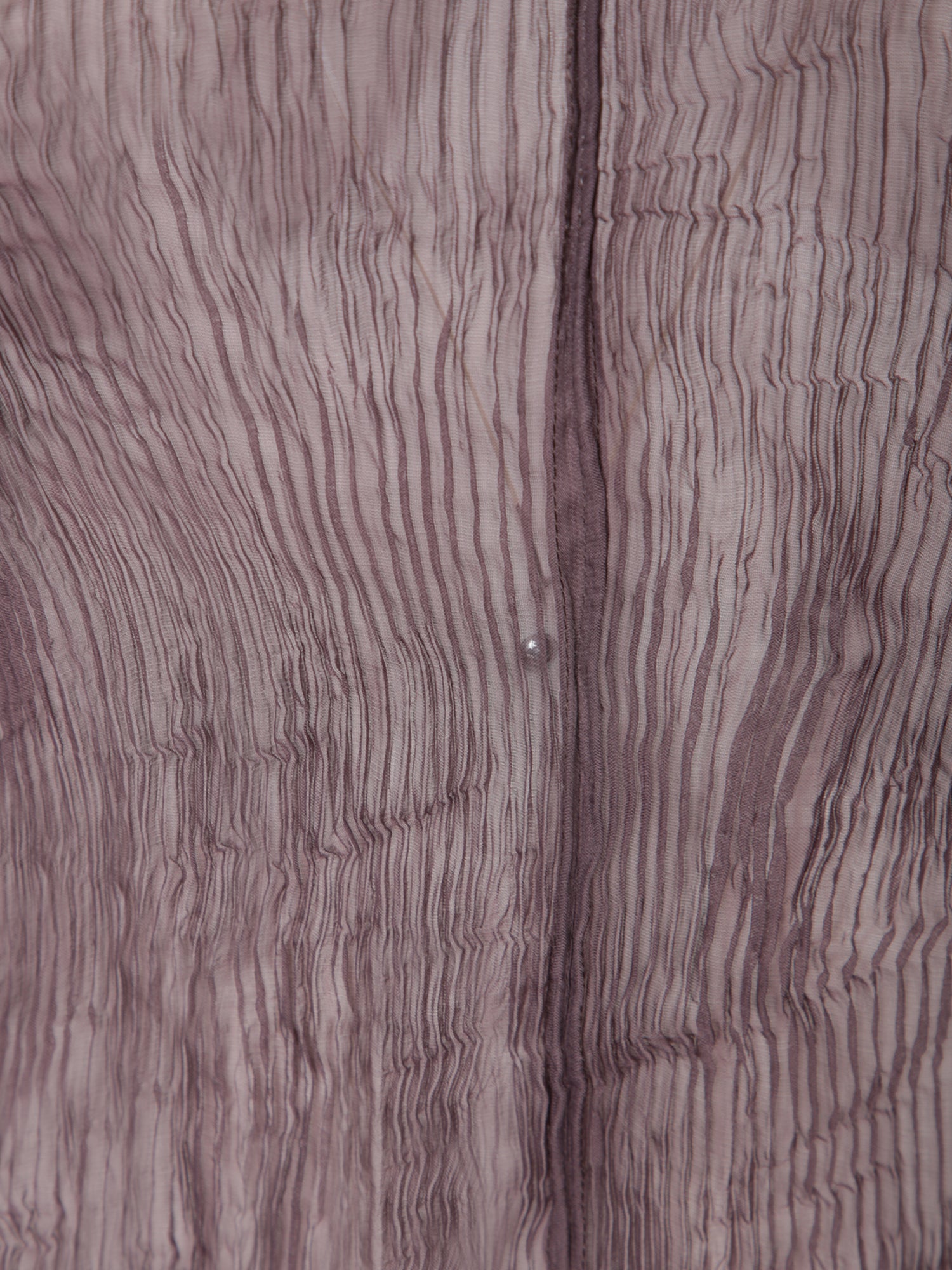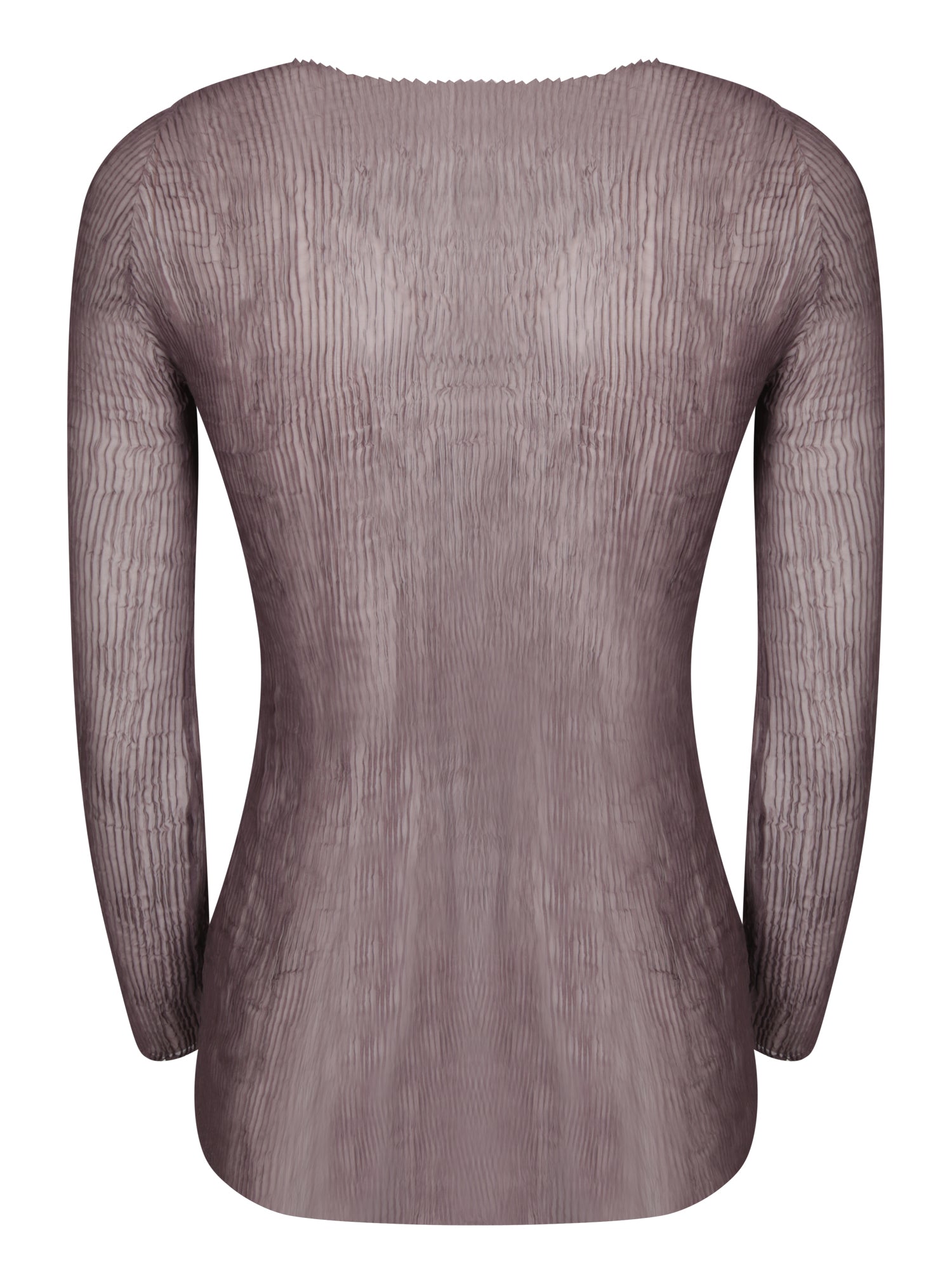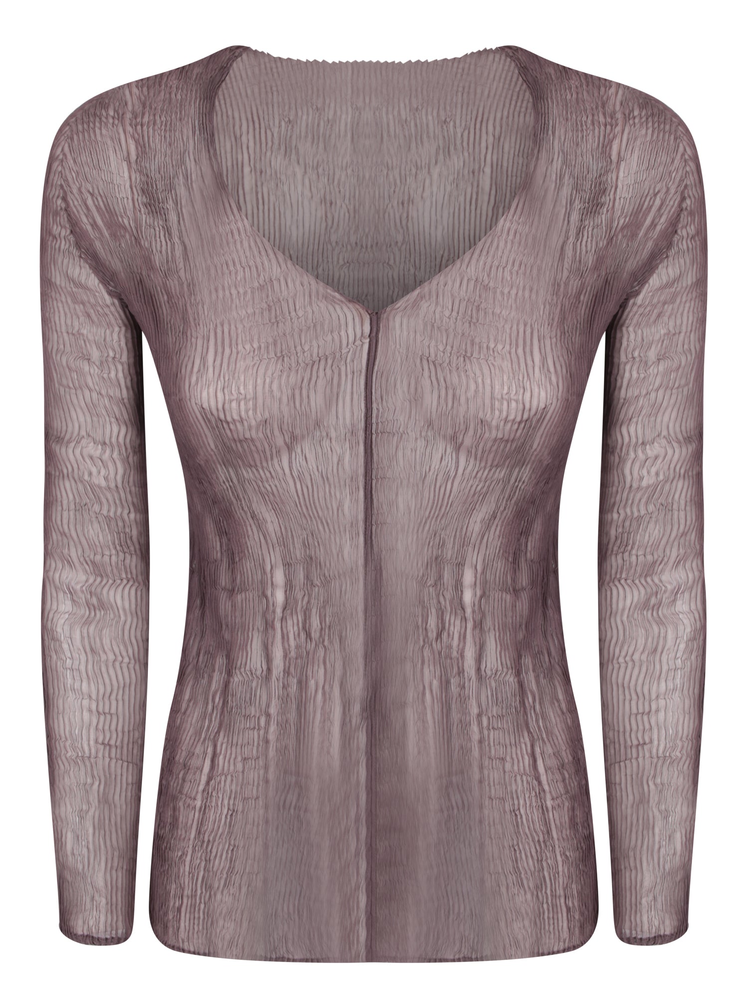 This elegant Issey Miyake top features an intriguing twisted design that hugs the figure, crafted in lightweight brown chiffon for a touch of sophisticated femininity.