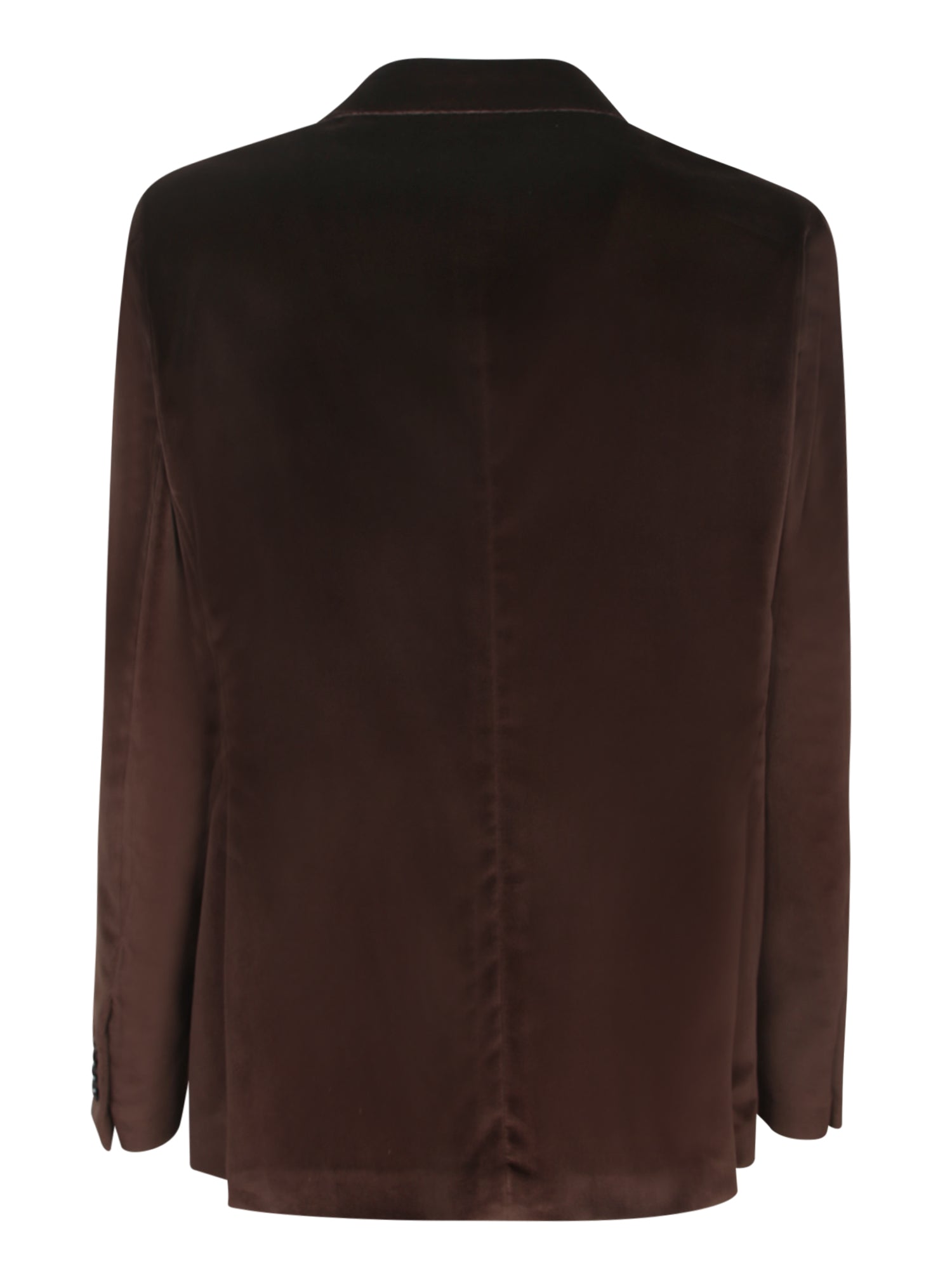 Velvet jacket with a single front button. Classic lapels. Flap pockets and a chest pocket.