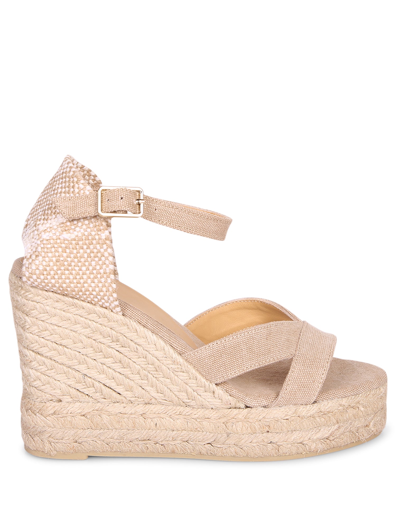 Braided jute wedge. Sand fabric upper. Adjustable ankle strap. Open front design.