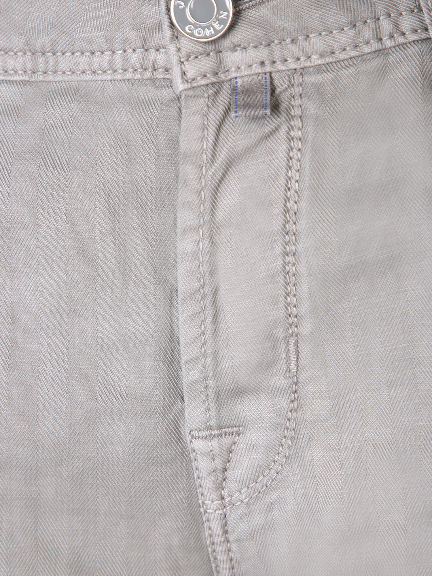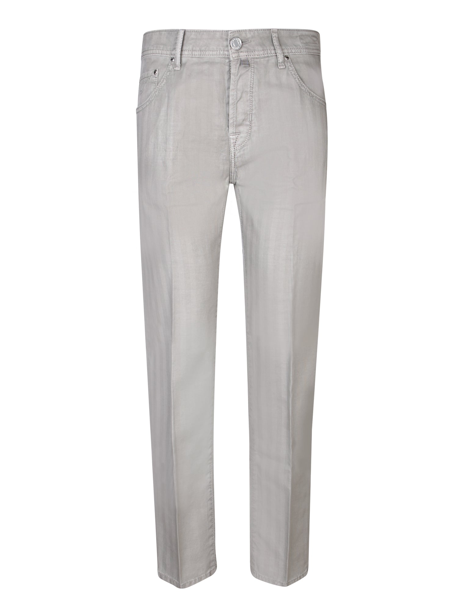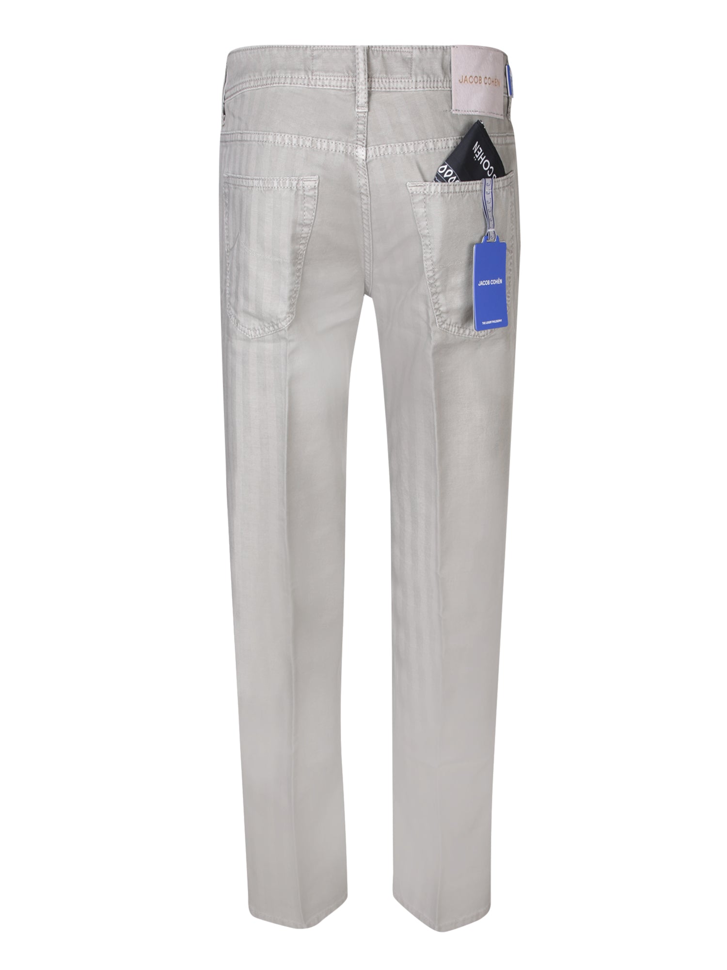 Mid-rise. Front zip and button fastening. Side pockets. Belt loops.
