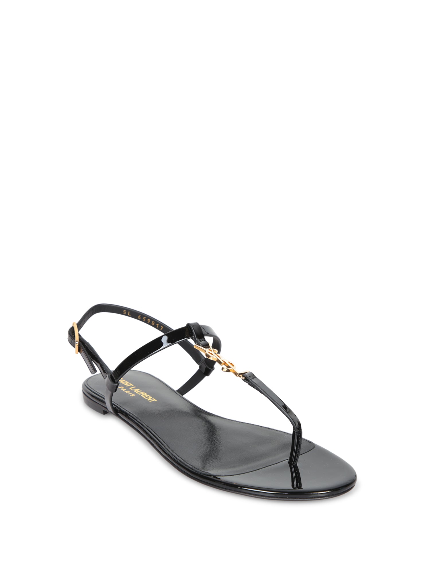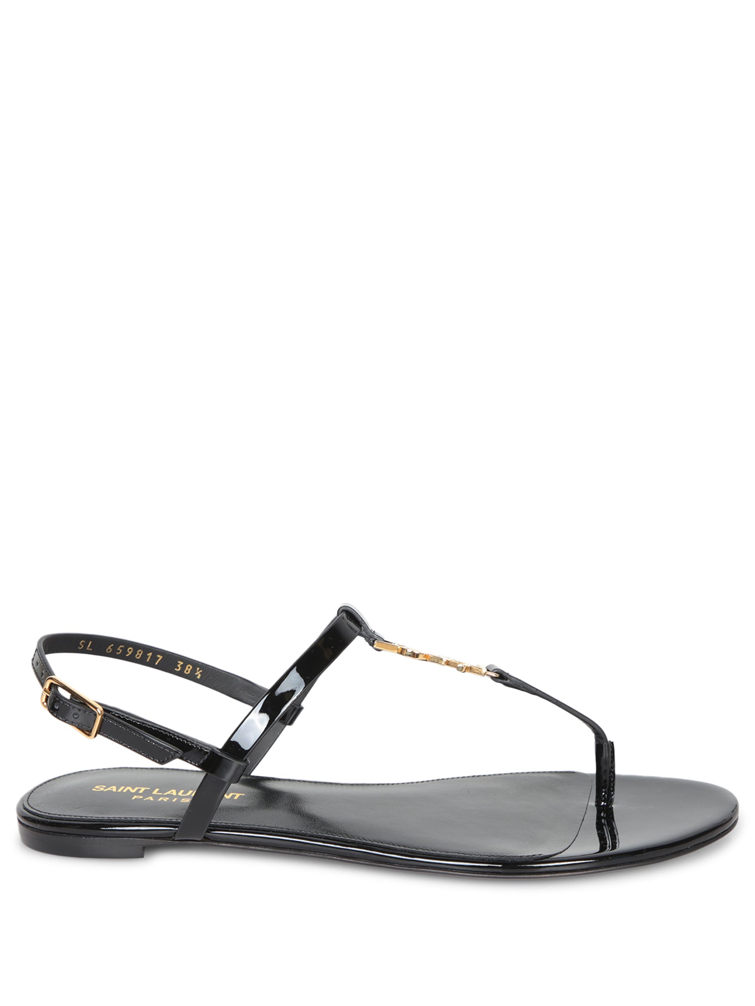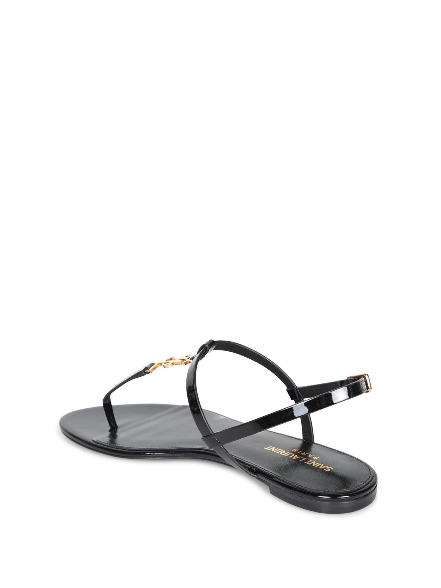 Elegant black patent sandals. Strap detail with buckle and golden logo. Flat sole.
