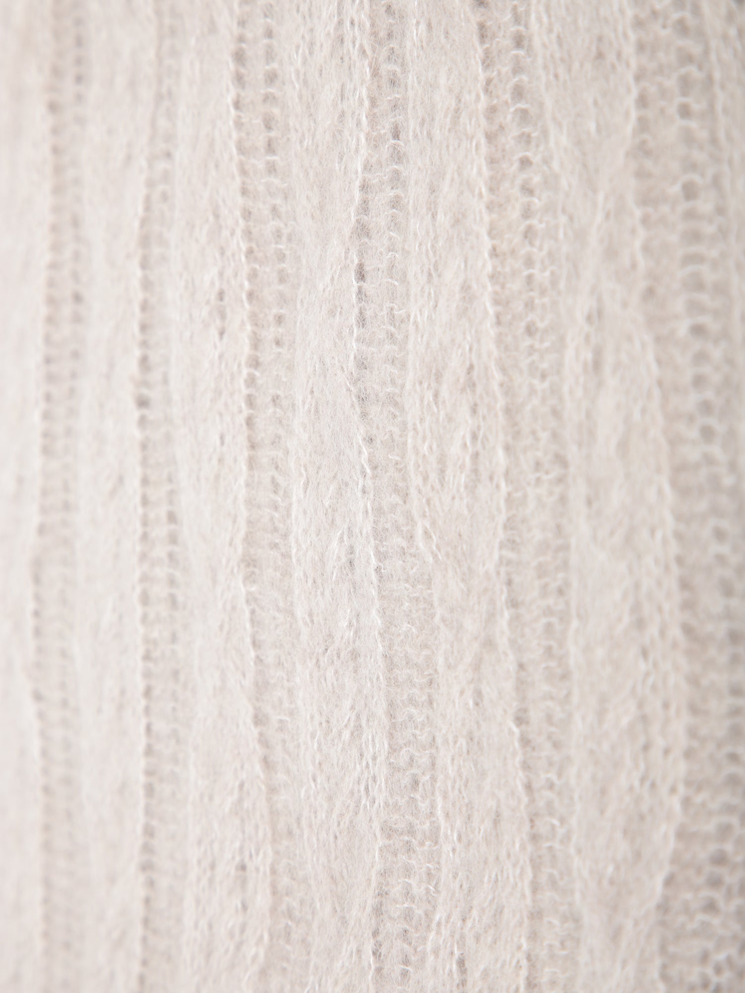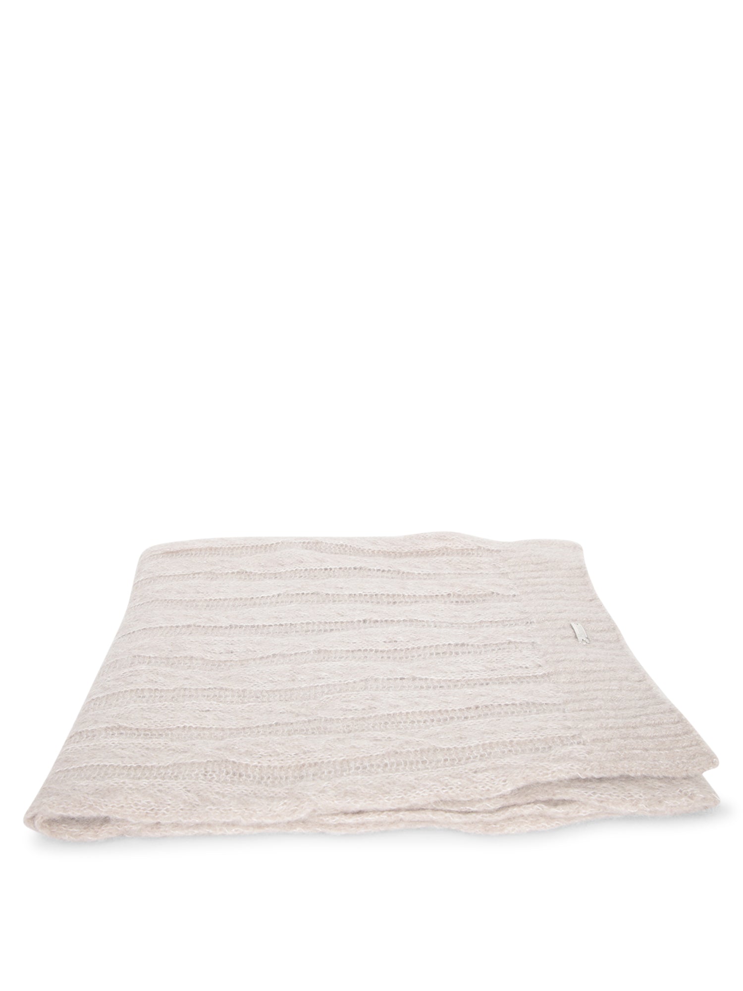 Alpaca wool knit scarf. Ivory hue. Design features horizontal stripe pattern.