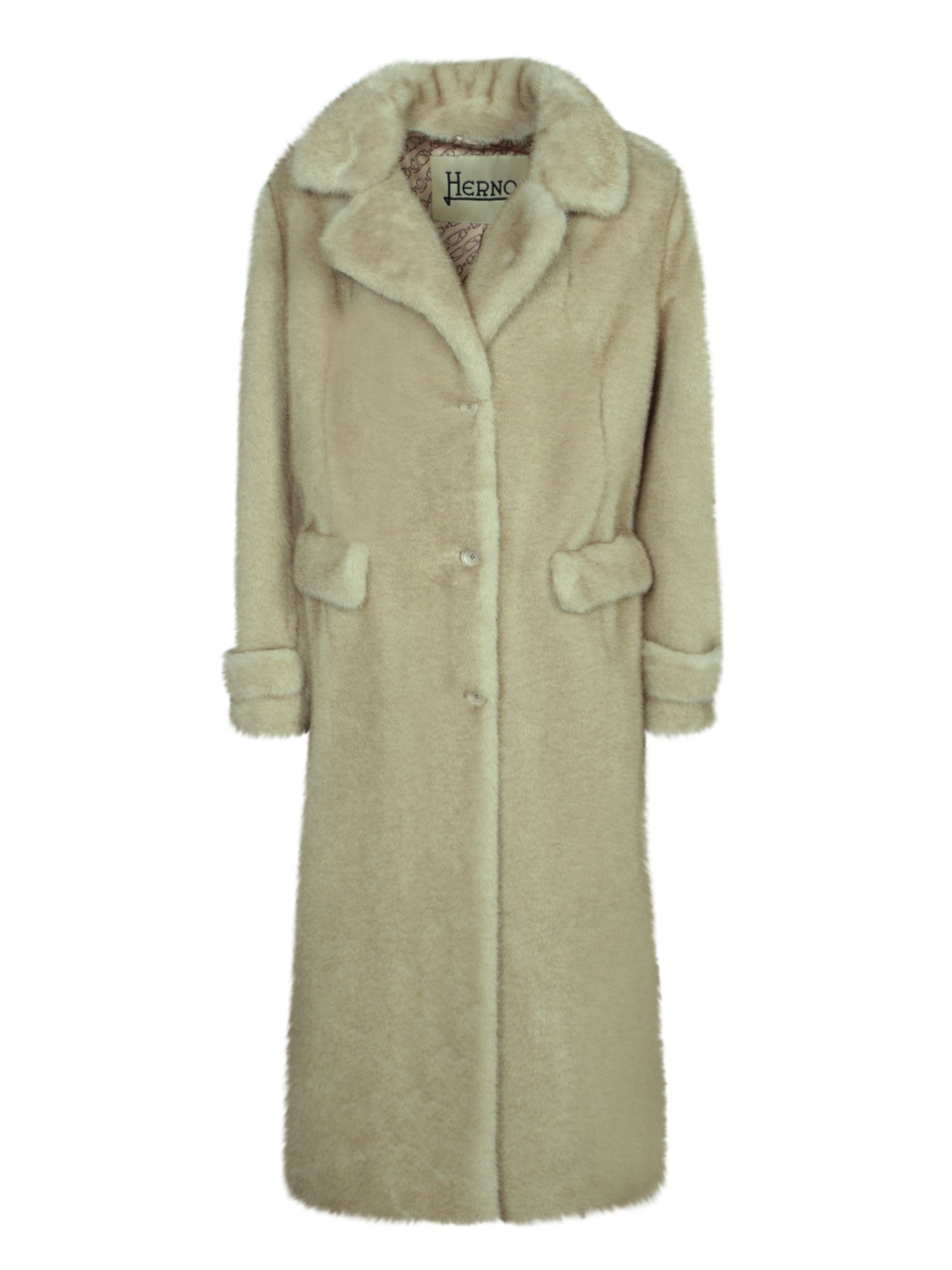 Long coat with lapel collar, button front closure and applied side pockets.