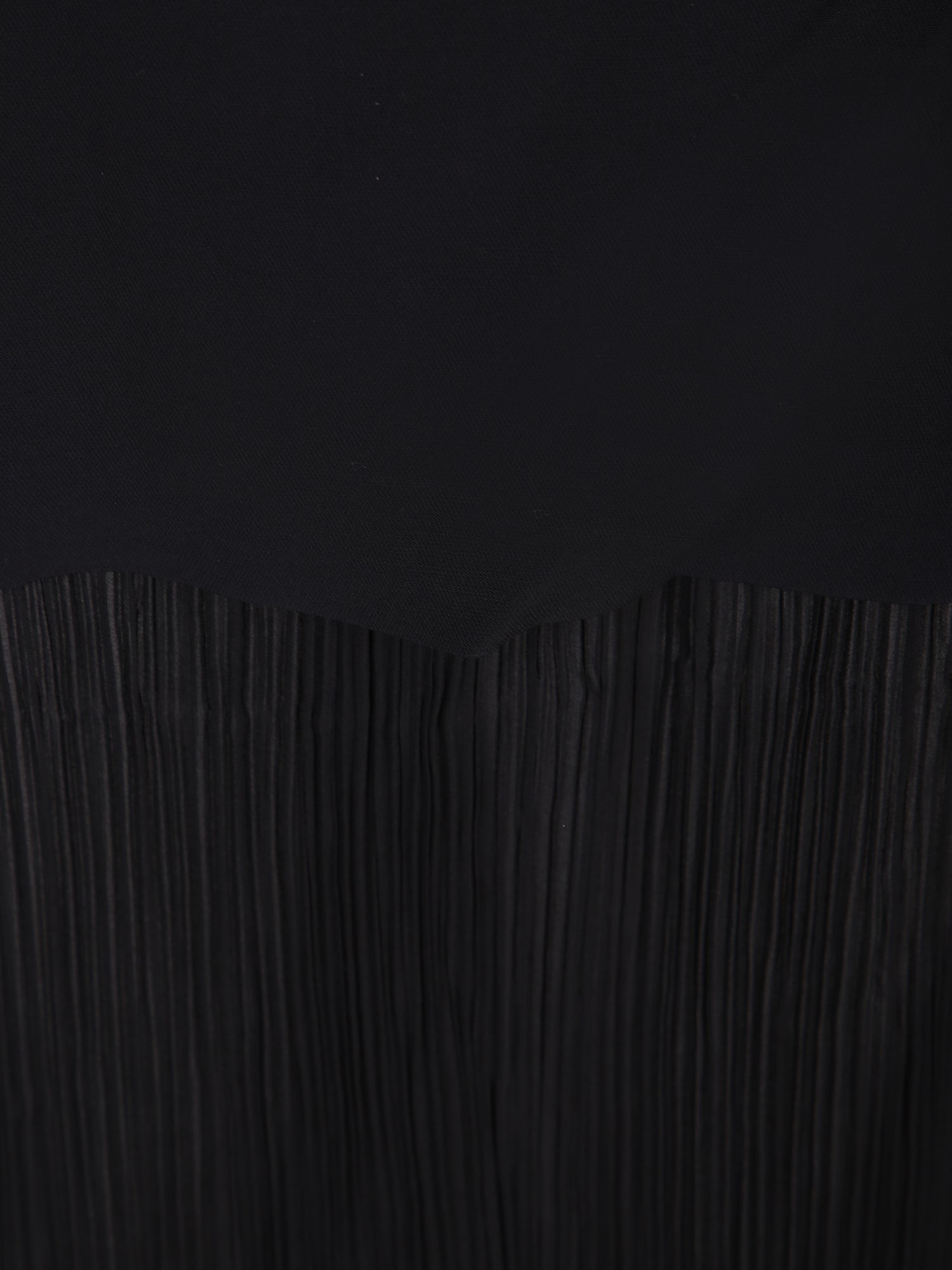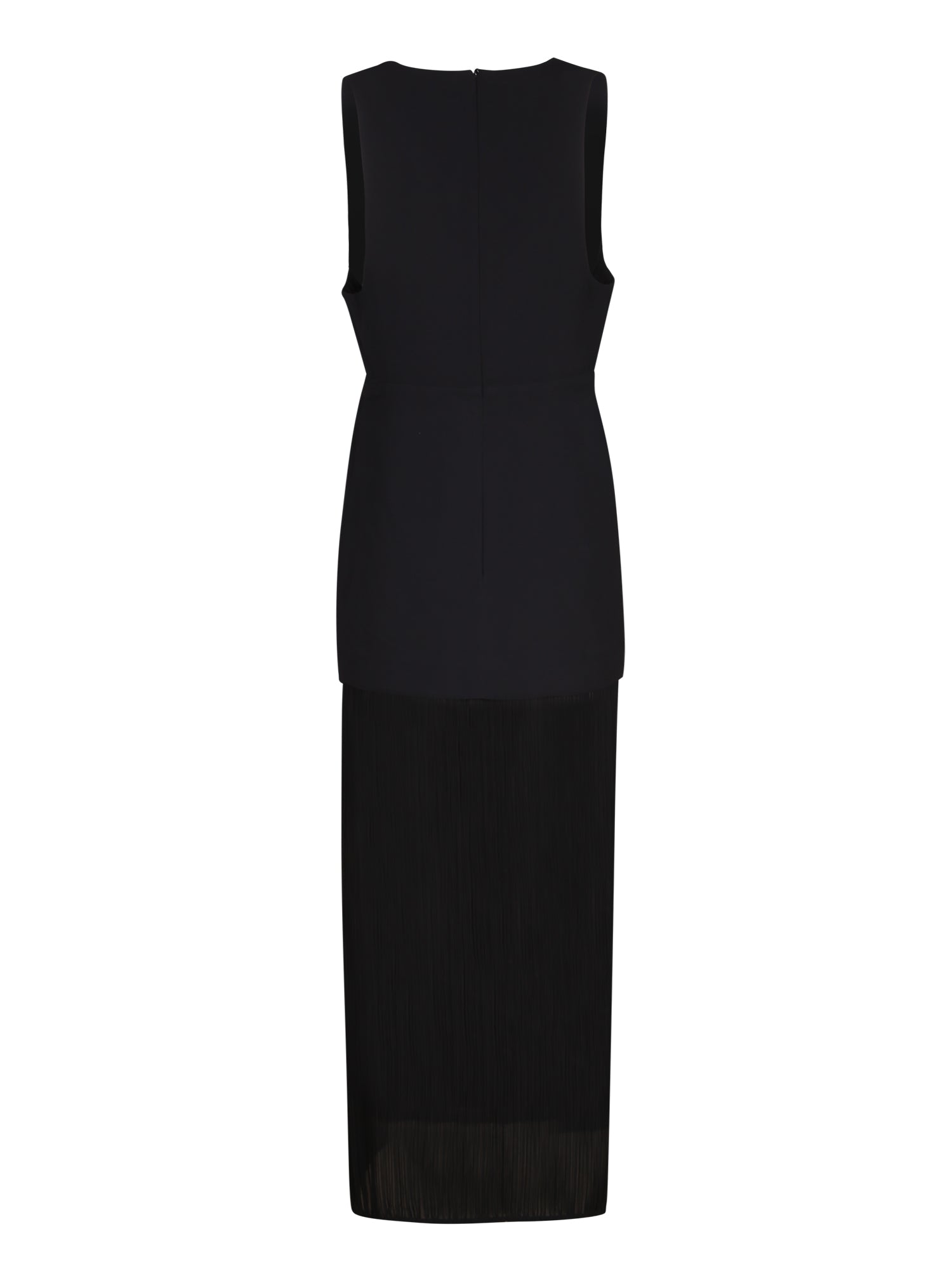 Sleeveless dress with V-neckline. Smooth upper fabric and pleated lower fabric.