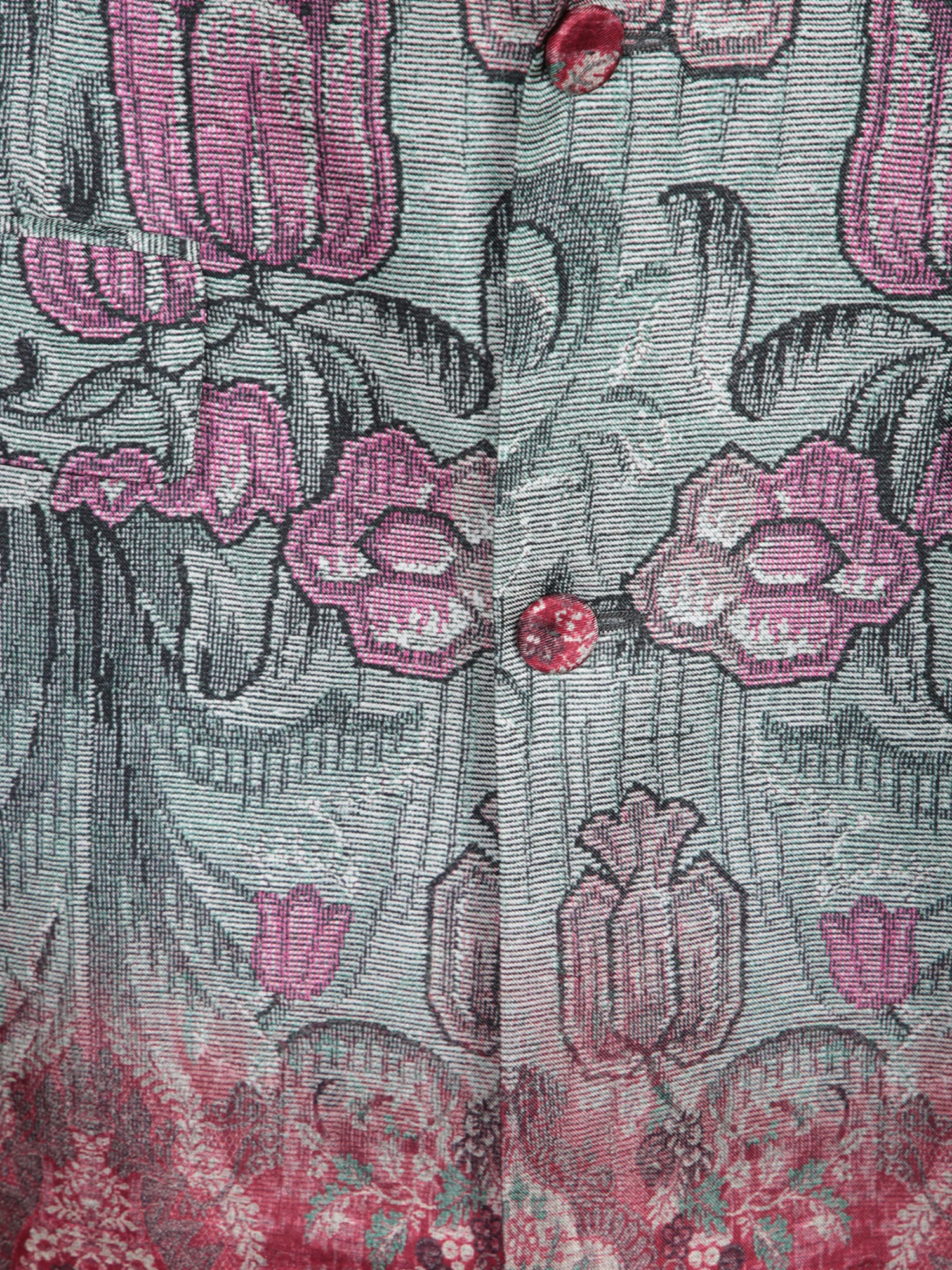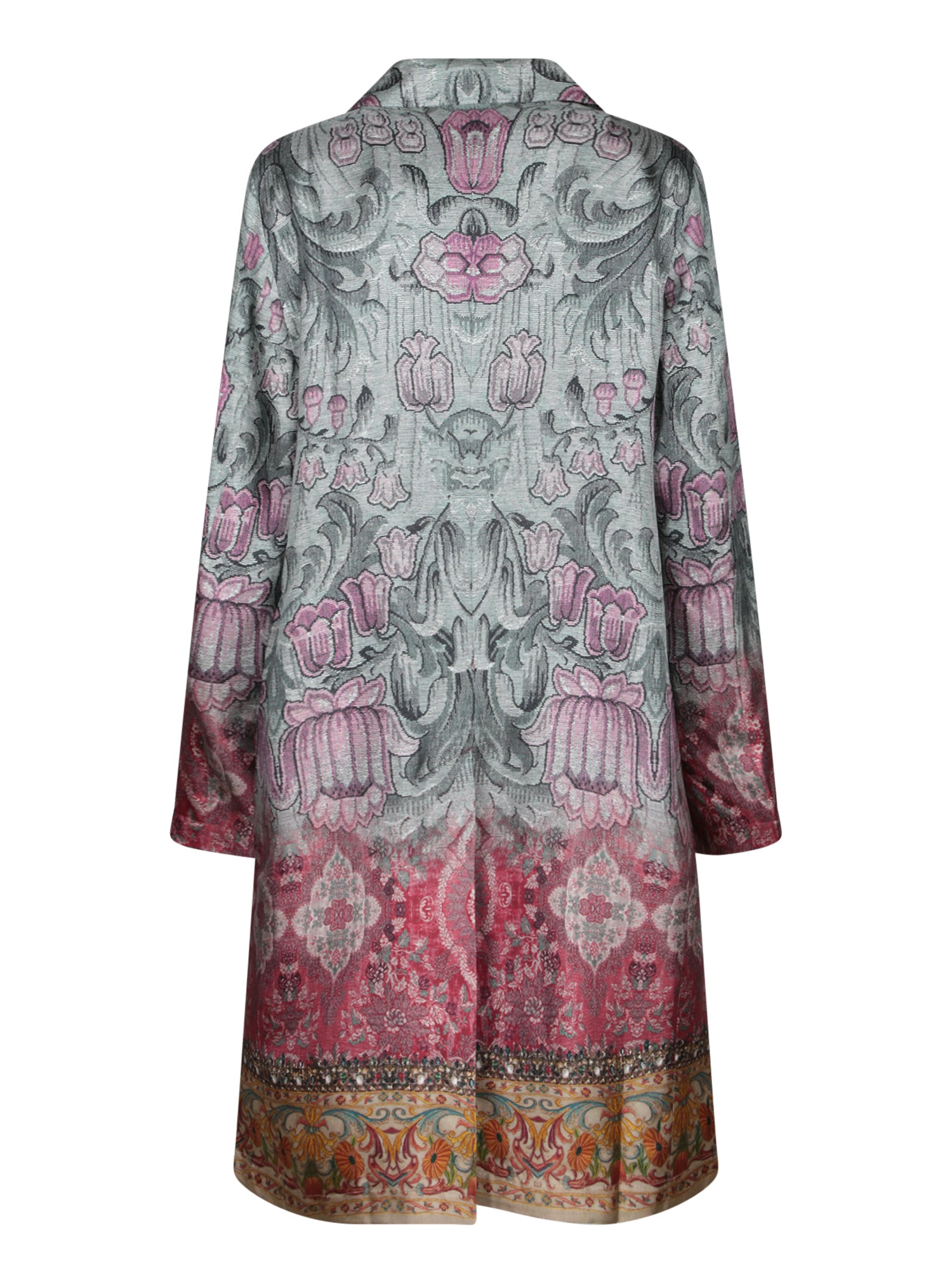 Multicolor floral printed coat. Classic lapel collar. Front button closure.