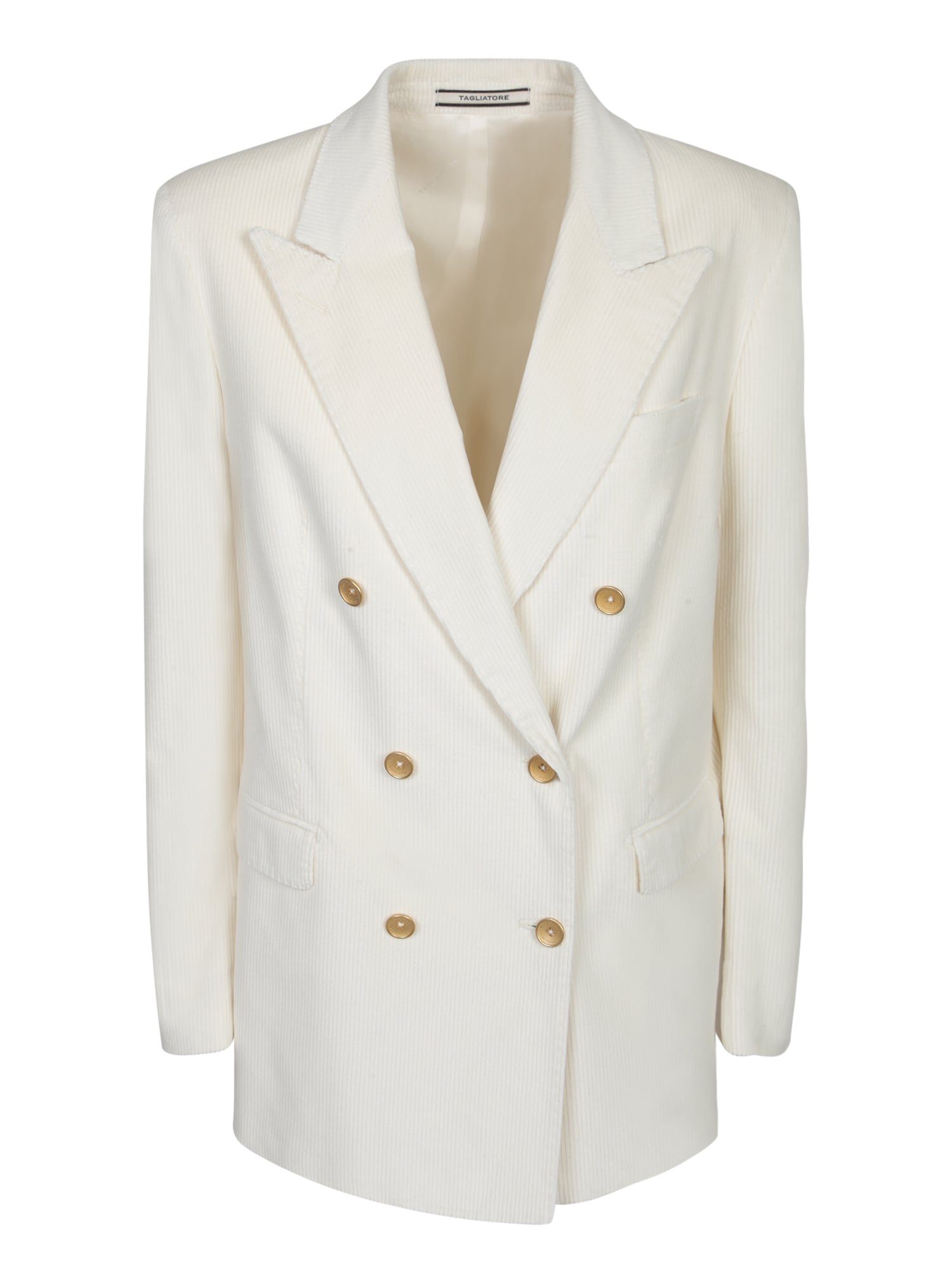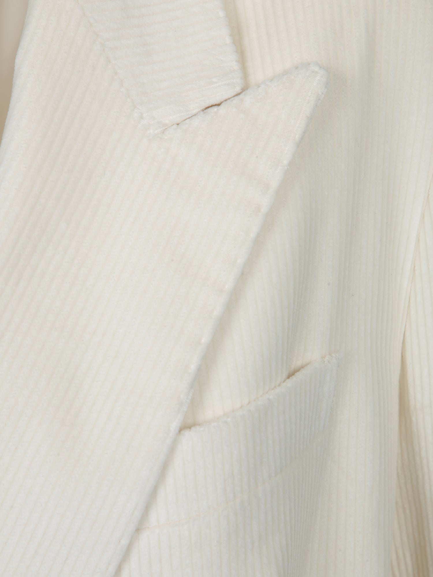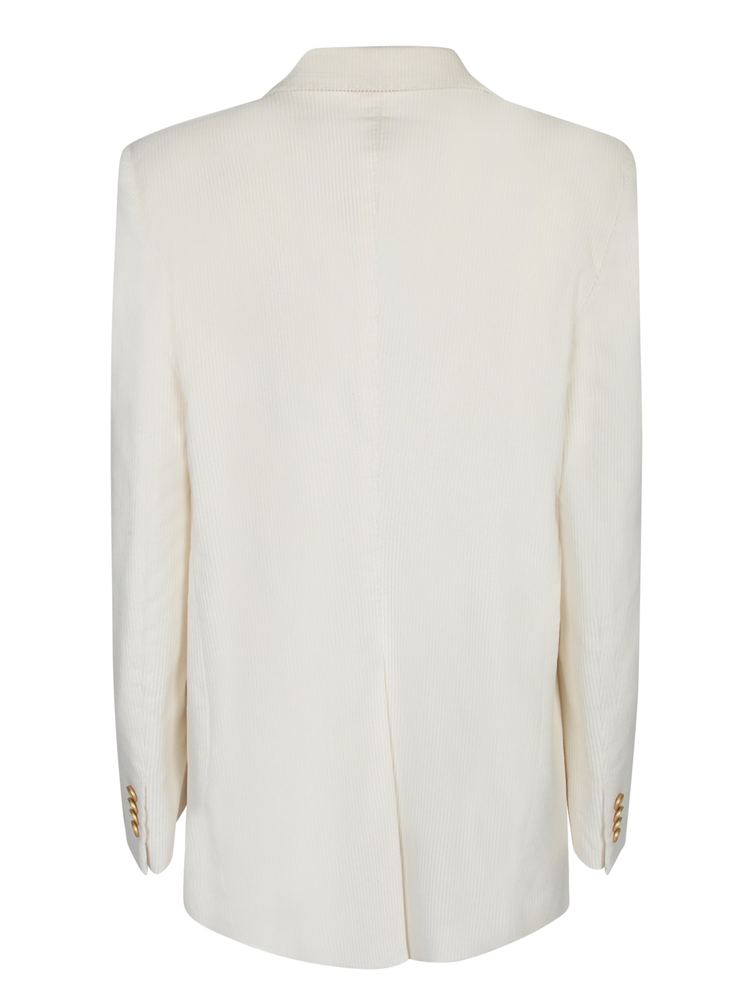 Corduroy jacket with double-breasted closure. Cream color. Features golden buttons and front pockets.