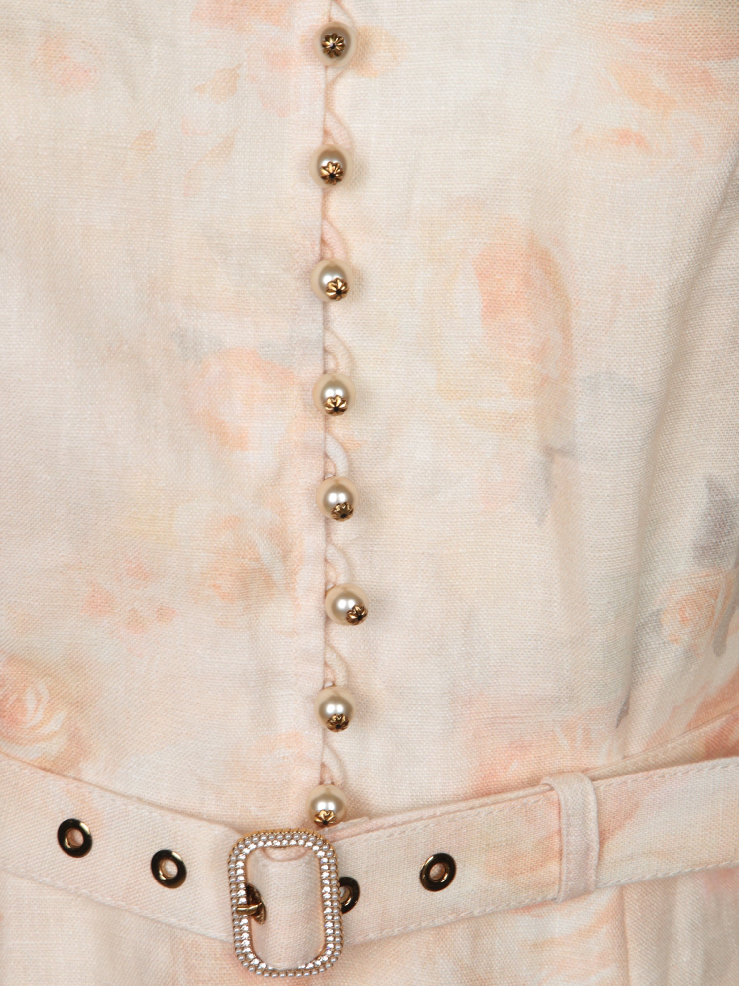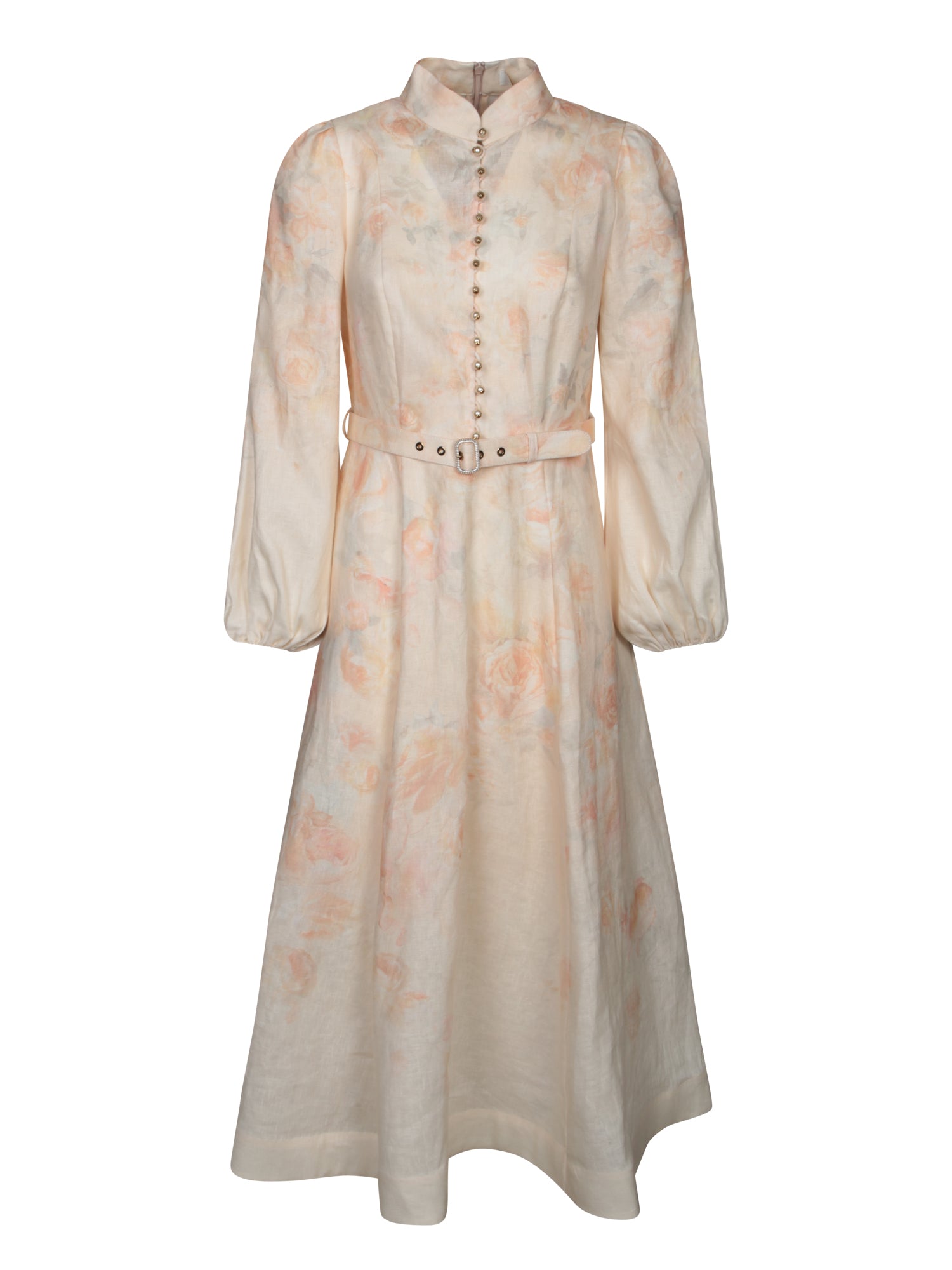 Explore modern femininity with the Zimmermann midi dress, adorned with a delicate pastel floral print. The classic collared design and flared line enhance the silhouette, while the belt elegantly accentuates the waist.