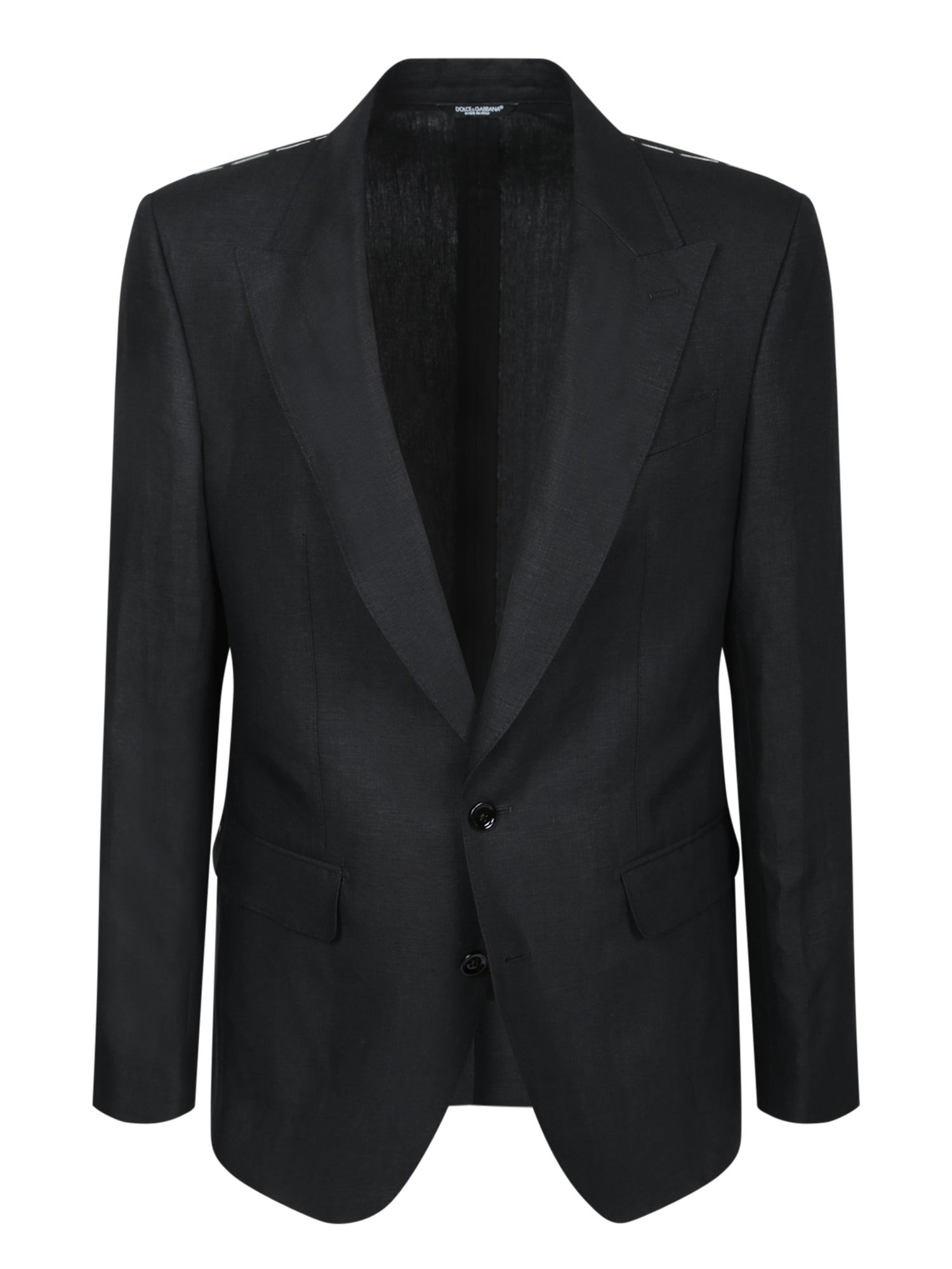 This elegant black jacket by Dolce & Gabbana, features a sophisticated design with peak lapels, a two-button closure, and tailored details that enhance its fit and elegance.