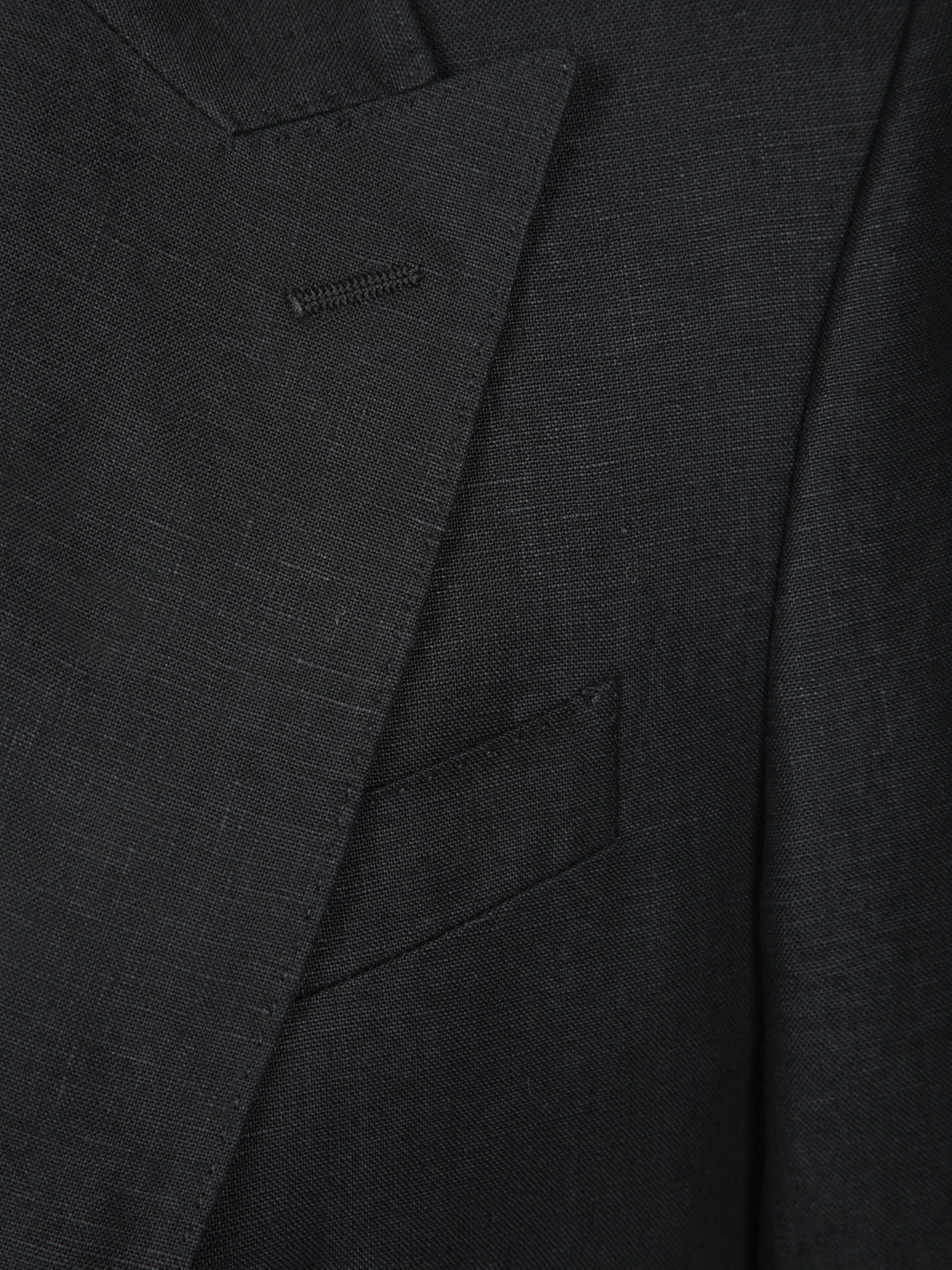 Two-button jacket in black fabric. Long sleeves, two welt pockets and a chest pocket.