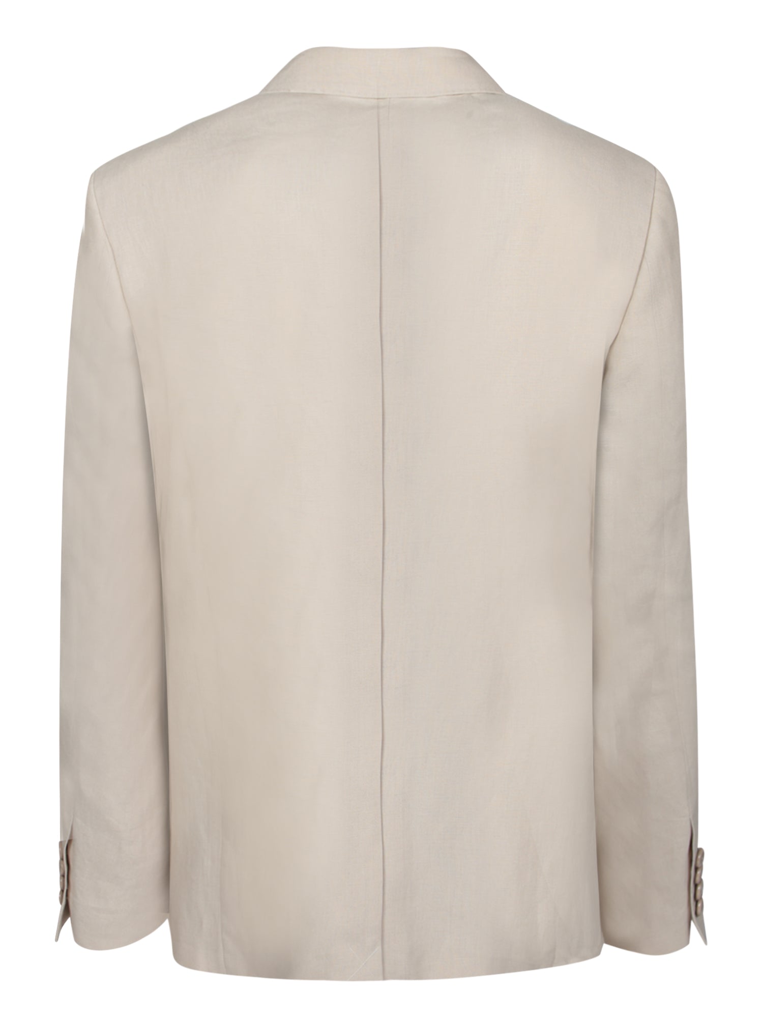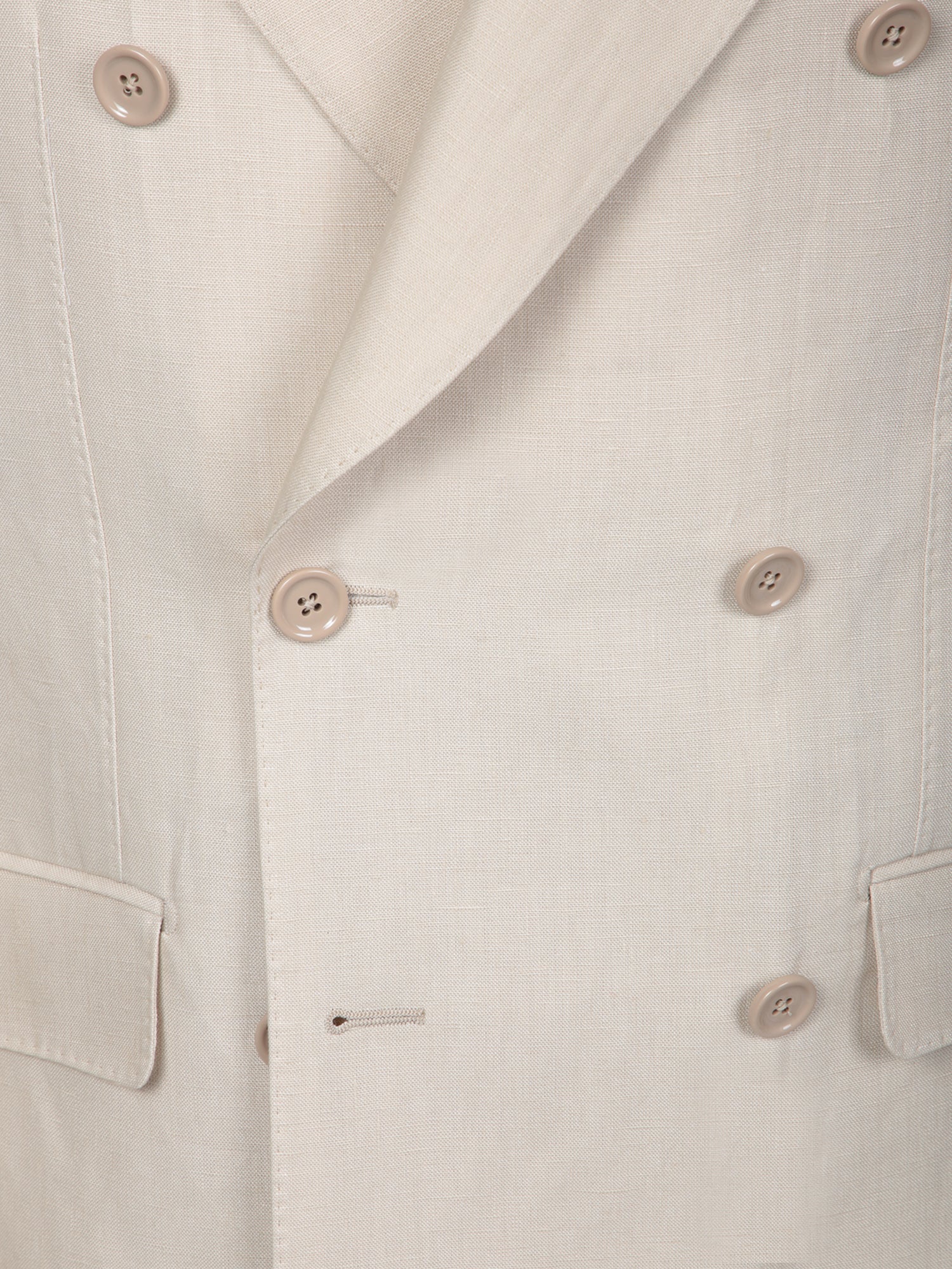 Double-breasted jacket crafted from linen. Features classic lapels, front button closure, and flap pockets.