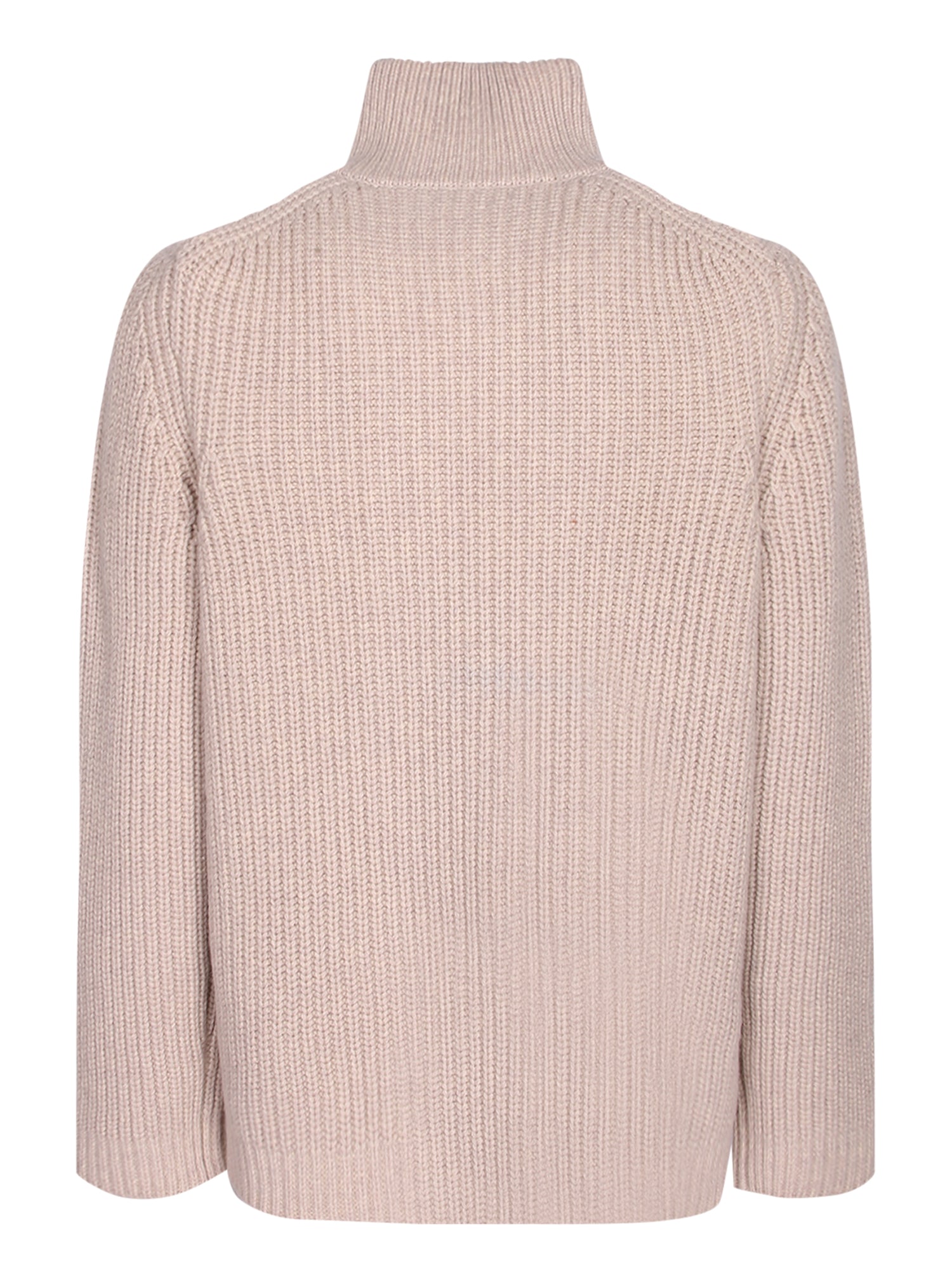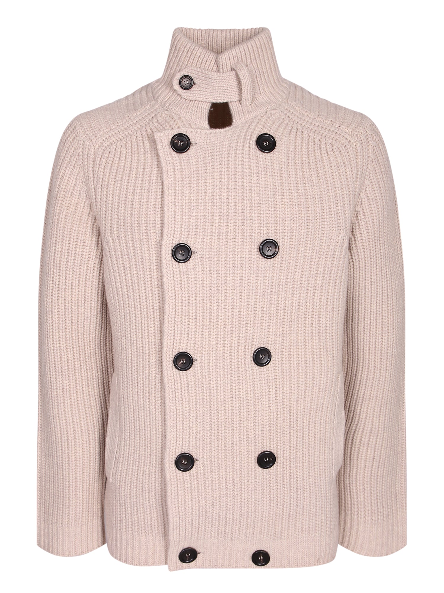 Natural wool cardigan with a high collar and double-breasted closure. Features large black buttons and a brown detail on the back of the collar.